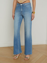 Fitted and flattering through the hips, the Scottie is our classic wide-leg jean. Now in a light wash. • Super stretch denim • High rise • 5-pocket design • Raw hem • Zip fly and button closure Style No. 2850NNBR-CALL DETAILS & FIT - Model Details: Height 5'10" | Bust 34" | Waist 24" | Hips 35" | Wearing Size 25 - Rise: 10" - Inseam: 32" - Leg Opening: 20" MATERIALS & CARE Composition - 73% Cotton 26% Lyocell 1% Elastane - Imported Care - Machine wash