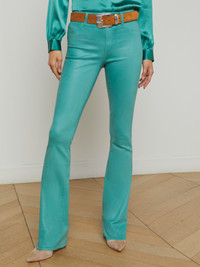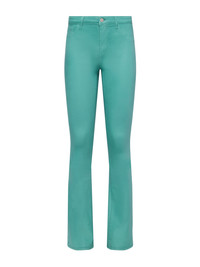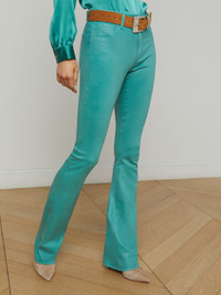 A sleek, slim bootcut, fitted through the hips and knee, built with a contoured waistband that securely hugs the natural waist without gaping. Now back in a beautiful green leather-look coated denim. • Super-stretch coated denim • High-rise baby bootcut • Faux front pockets • Functional back pockets • Zip fly and button closure • 34" inseam Style No. 2700PDDC-GRJC DETAILS & FIT - Model Details: Height 5'9" | Bust 30" | Waist 24" | Hips 34" | Wearing Size 25 - Rise: 9.75" - Inseam: 34" - Leg Opening: 17.5" MATERIALS & CARE Composition - 86% Cotton 11% Elastane 3% Spandex - Made in Los Angeles Care - Spot wash disinfect - Dry clean only