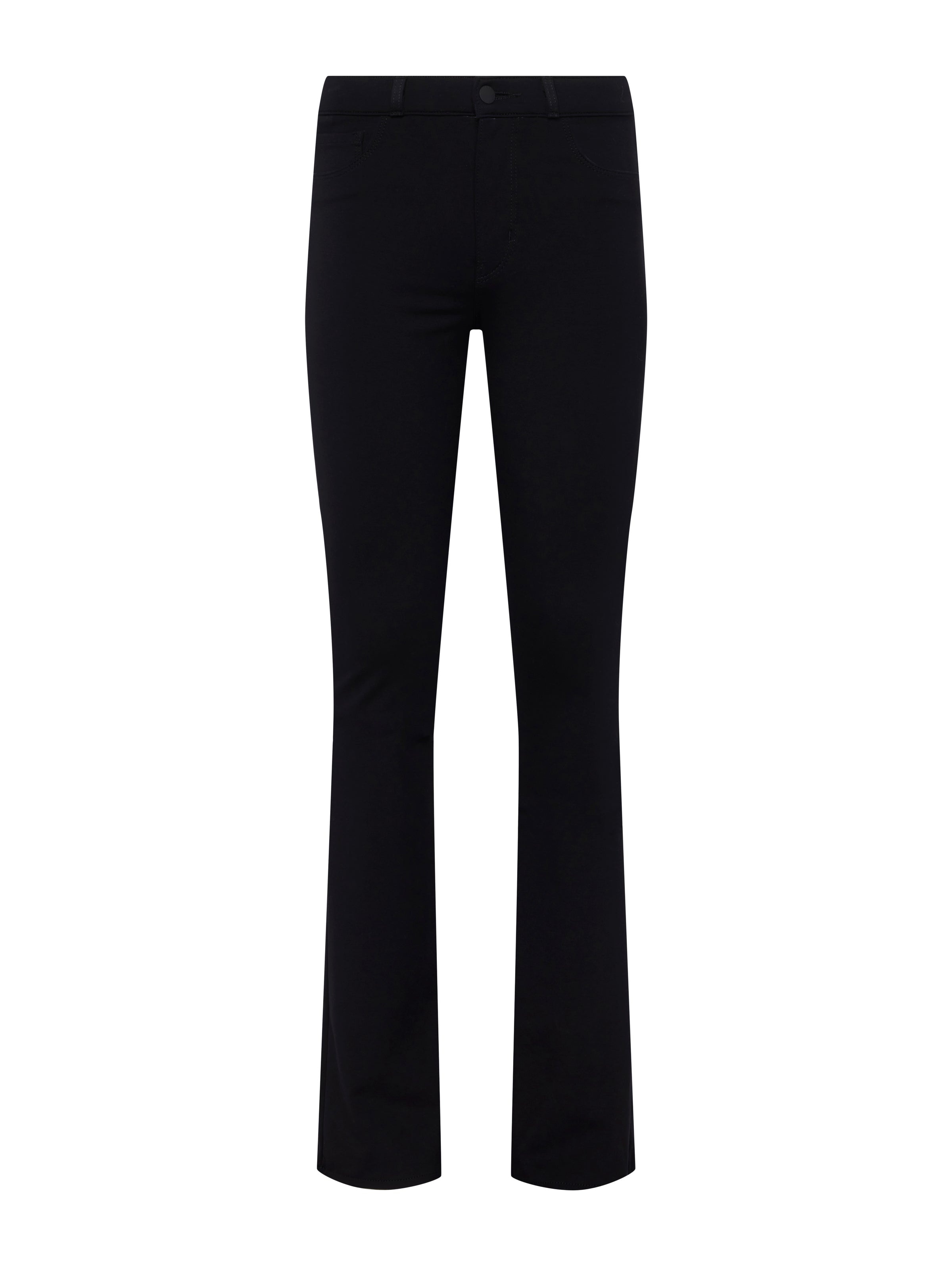A classic high-rise bootcut pant in true-black ponte. Contoured waistband fits securely at natural waist, then hugs from hip to knee before releasing into a slim bootcut hem. High-recovery ponte holds its shape, smoothing the figure without sacrificing comfort. Classic five-pocket construction and zip fly closure. Style No. 2700APT-BLAC DETAILS & FIT - Model Details: Height 5’9.5" | Bust 32" | Waist 24" | Hips 35" | Wearing Size 25 - Rise: 9.75" - Inseam: 34" - Leg Opening: 17.5" MATERIALS & CARE Composition - 82% Viscose 14% Nylon 4% Spandex - Made in Los Angeles