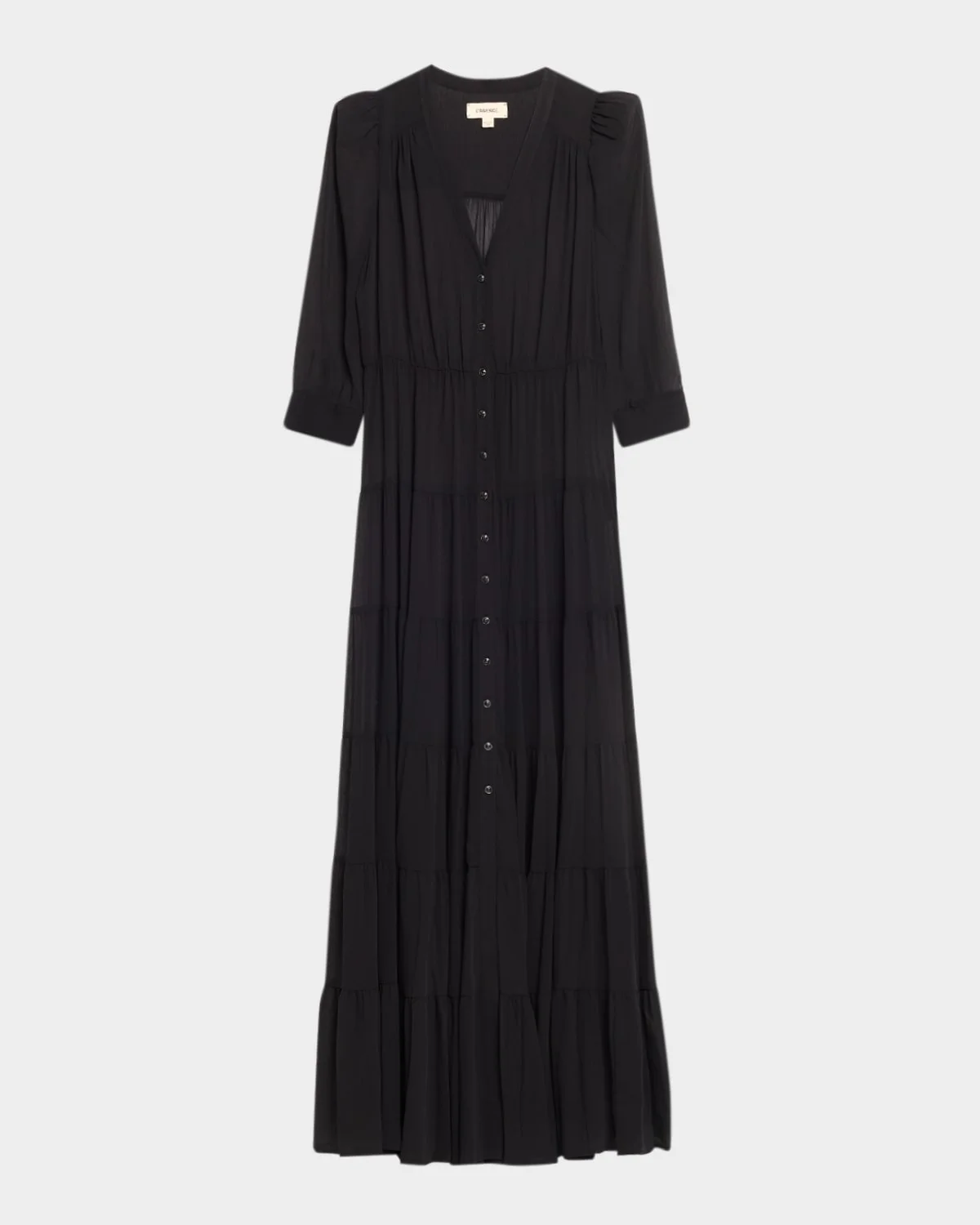 L'Agence "Seraphina" semisheer tiered dress finished with contrasting buttons V neckline Puffed shoulders 3/4 sleeves; button cuffs Yoked back Full length Button front closure Polyester Dry clean Imported