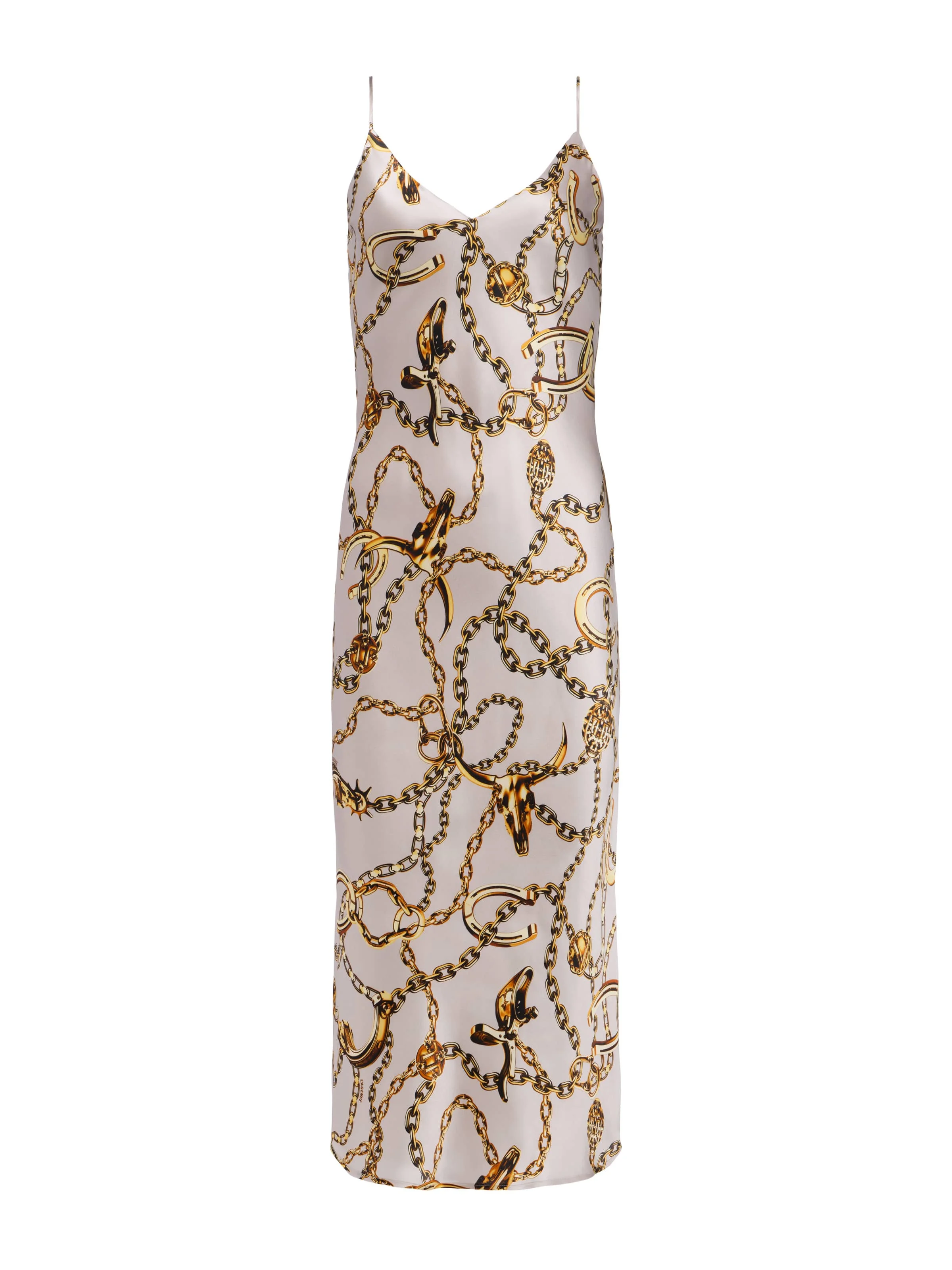 Style No. 61253BHC-SGLH DETAILS & FIT - Model Details: Height 5'8" | Bust 32" | Waist 24.5" | Hips 34" | Wearing Size 2 - About 45" From Shoulder to Hem MATERIALS & CARE Composition - 100% Silk - Imported Care - Dry clean only - Do not wash - No bleach - No tumble dry - Low iron if needed