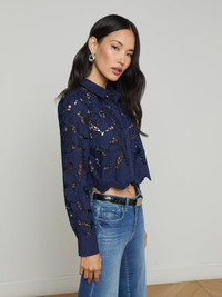 Our modernist spin on a lace blouse, the Seychelle delivers classic shirting details in a cool cropped cut. Now in navy. • 100% cotton • Relaxed fit • Scalloped hem • Unlined • Front button closure Style No. 40587PCS-NAVY DETAILS & FIT - Model Details: Height 5'9" | Bust 30" | Waist 24" | Hips 34" | Wearing Size XS - About 18.4" From Shoulder to Hem - Sleeve Length: 23.25" MATERIALS & CARE Composition - 100% Cotton - Imported Care - Hand wash gentle in cold water - Do not tumble dry - Do not bleach - Do not wring - Cool iron if needed