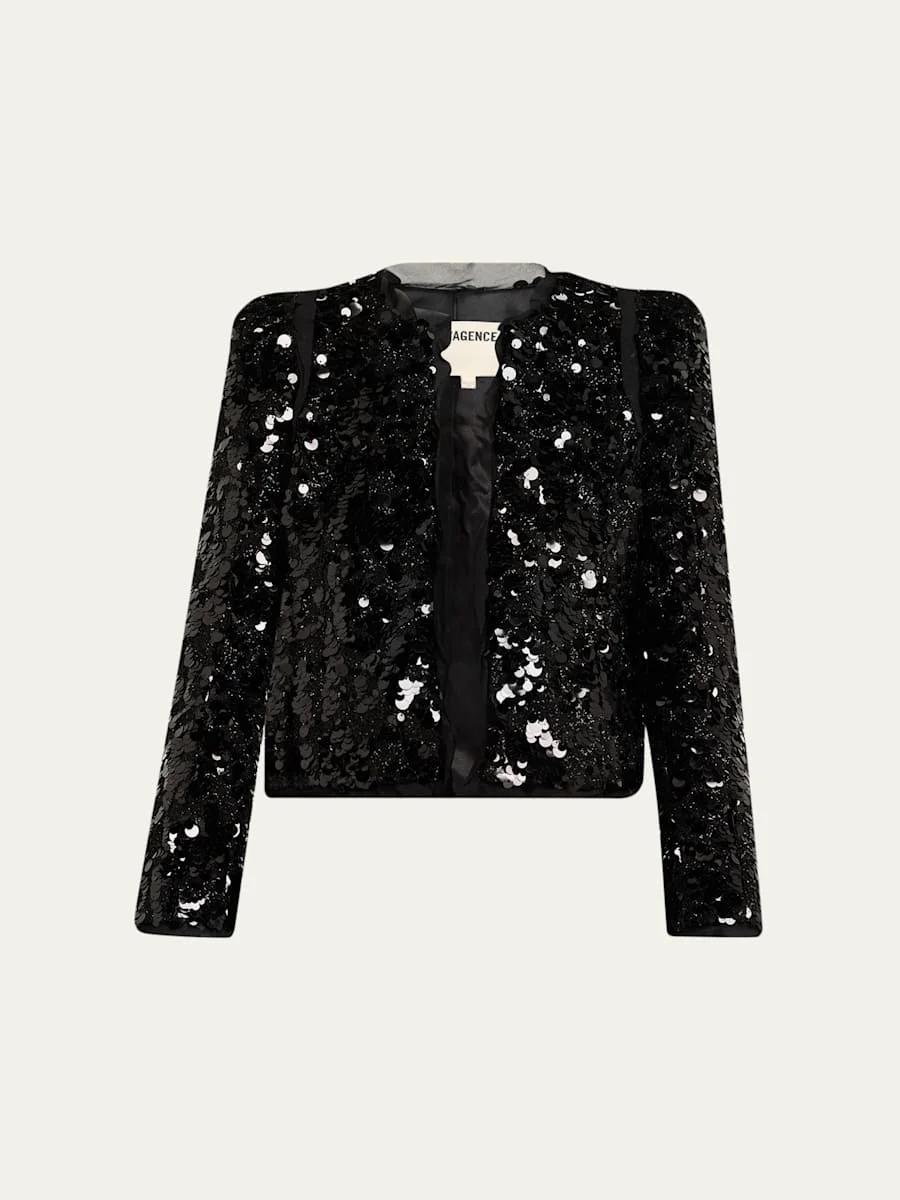 Designed in metallic tweed with shimmering paillette sequins, the "Shai" jacket L'Agence features tonal chiffon trim Approx. 20.5"L from shoulder to hem Collarless neckline Strong padded shoulders Long sleeves Slightly copped hem Hookandeye front closure Polyester Hand wash Imported