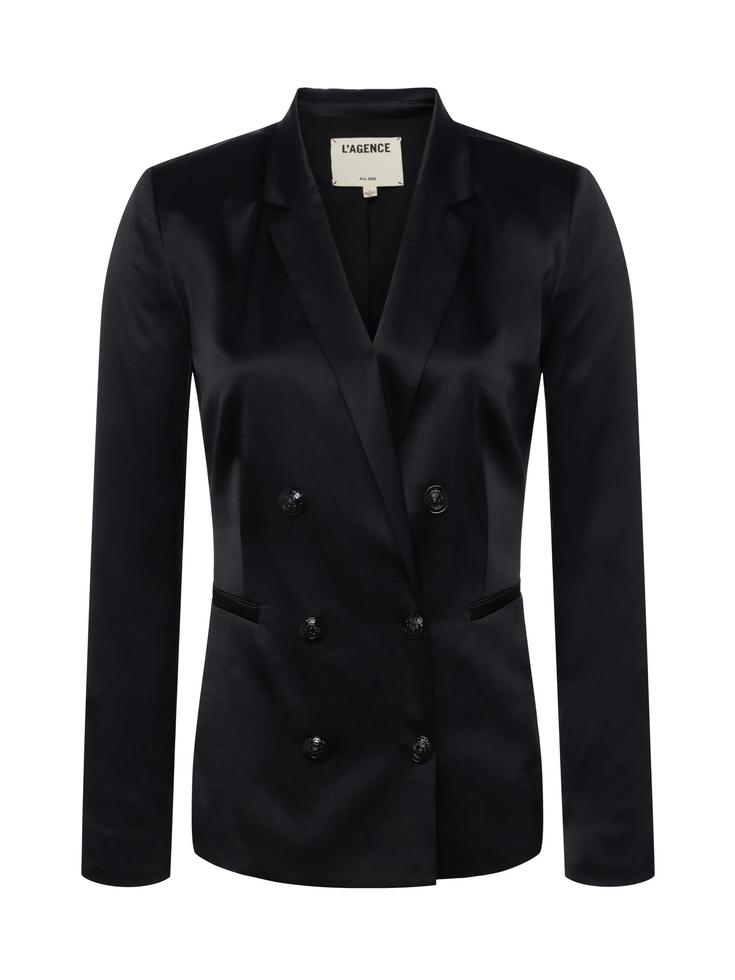 A timeless double-breasted blazer in black silk charmeuse. The fully lined Colin blazer offers tailored appeal with strong shoulders, sleek lapels, and welt pockets. Fastens in front with lustrous embossed-dome buttons. Complete your power suit by pairing with the coordinating Gavin pant. Style No. 1485CHM-BLAC DETAILS & FIT - Model Details: Height: 5’9” | Bust 32” | Waist 24” | Hips 35” | Shoe 7 | Wearing Size 2 - About 26.75" From Shoulder to Hem - Sleeve Length: 24.25" MATERIALS & CARE Composition - 100% Silk - Imported