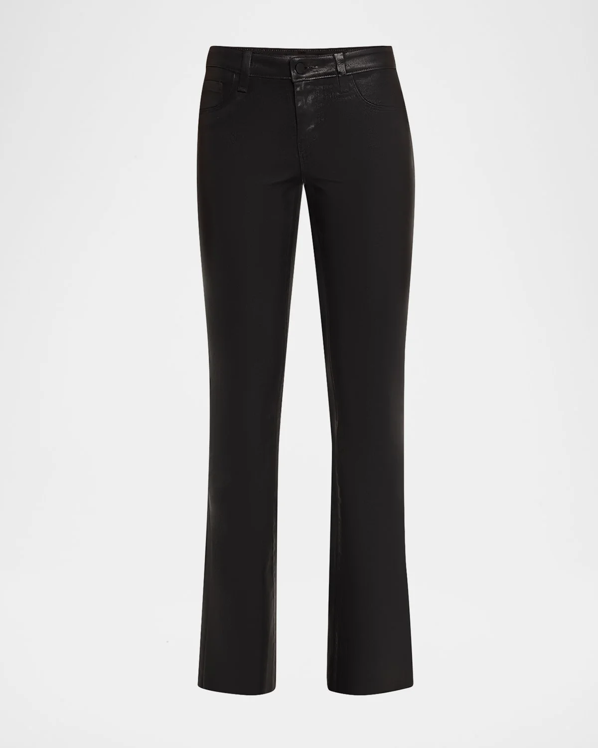 L'Agence "Sneeki" jeans in coated black denim Lowrise; sits at the hip Fivepocket style Fitted through the hip and thigh Full length Button/zip fly; belt loops Cotton/elastane/spandex Made in USA