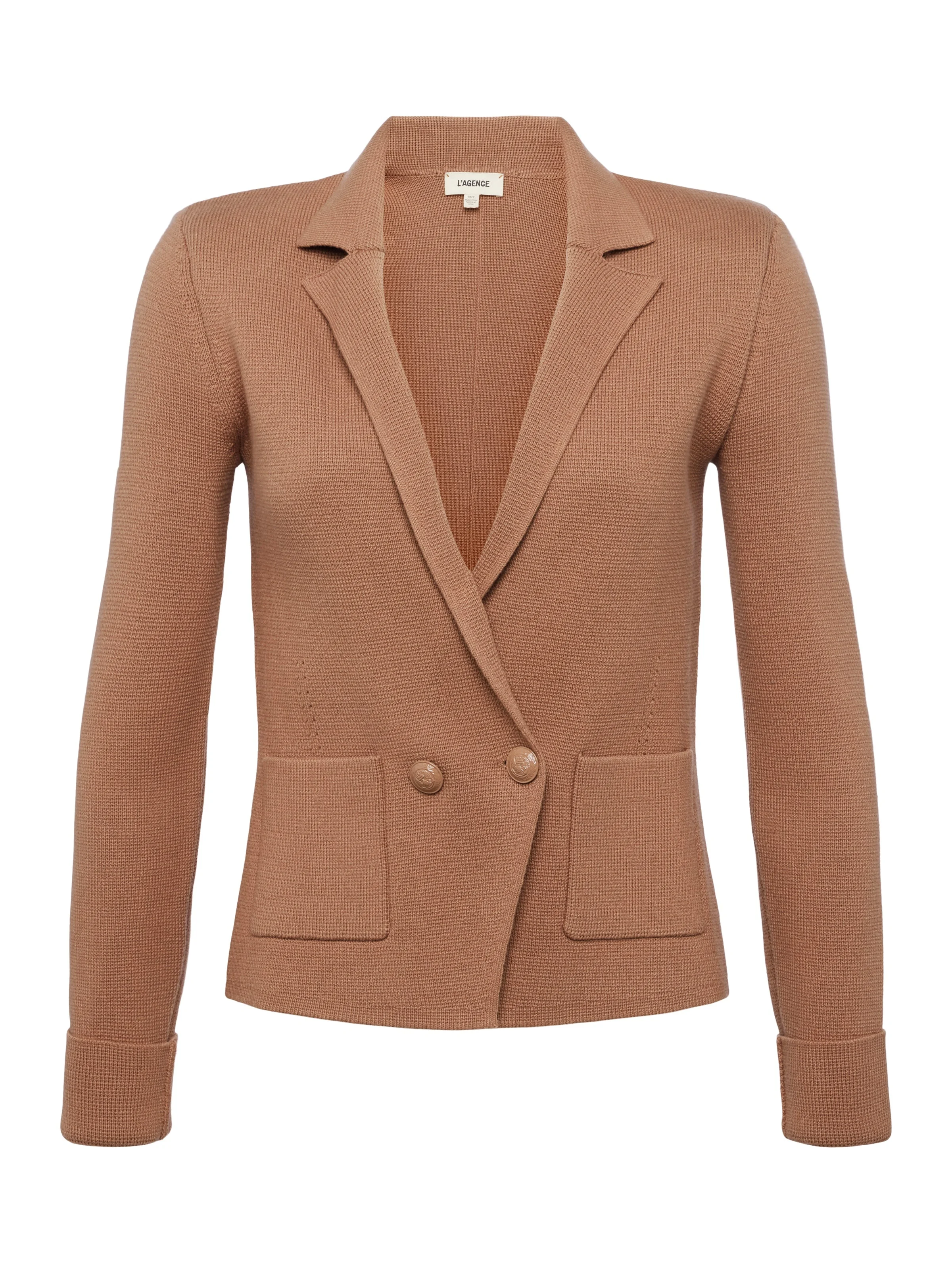 A double-breasted blazer in a gingersnap-brown premium knit. Tapered at the waist, supple, feminine style is balanced by smart tailored touches like strong shoulders, sleek lapels and patch pockets. Gleaming gold embossed-dome buttons add a luxe finish. Style No. 8891FBA-GING DETAILS & FIT - Model Details: Height: 5'10" | Bust: 32" | Waist: 24'' | Hips: 34.5'' | Wearing Size XS - About 22.5" From Shoulder to Hem - Sleeve Length: 24.25" MATERIALS & CARE Composition - 50% Cotton 40% Acrylic 10% Nylon - Imported Care - Hand wash - Cold water - Do not dry clean - No bleach - Lay flat to dry - No tumble dry - Cool iron on reverse when needed