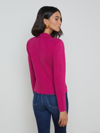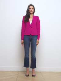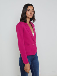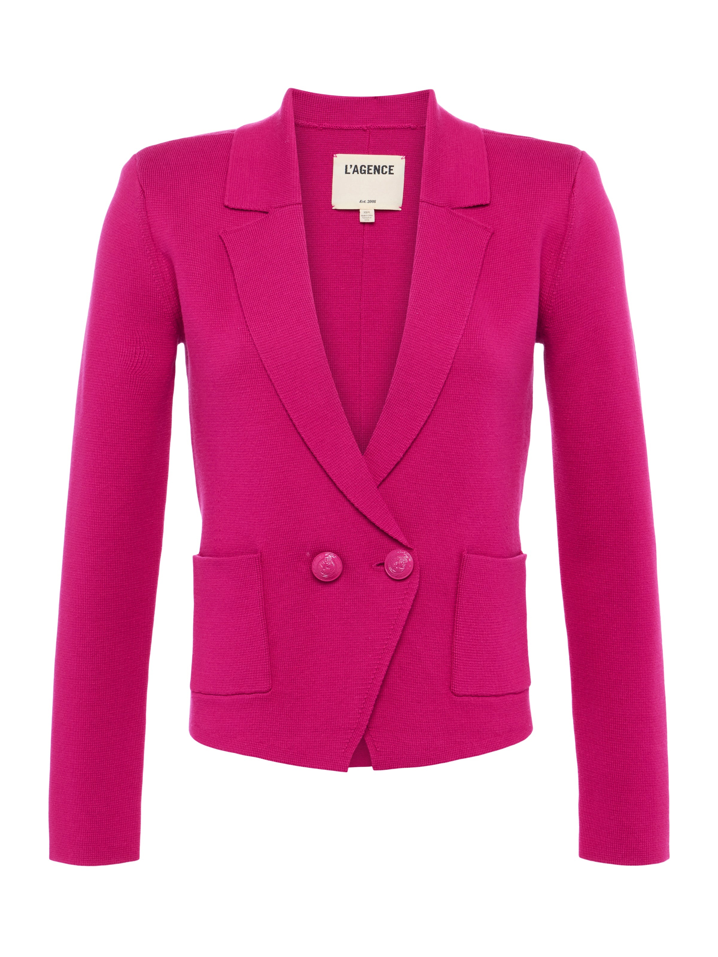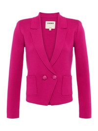 Sofia is a classic tailored design, offered in a deep pink ultra-wearable knit. • Premium suiting knit • Double-breasted style • Strong shoulders • Patch pockets • Tonal embossed dome buttons • Front button closure Style No. S8891FBA2-RUBY DETAILS & FIT - Model Details: Height 5'9.5" | Bust 32" | Waist 24" | Hips 35" | Wearing Size XS - About 22.6" From Shoulder to Hem - Sleeve Length: 23.25" MATERIALS & CARE Composition - 55% Cotton 45% Acrylic - Imported Care - Hand wash - Cold water - Do not dry clean - No bleach - Lay flat to dry - No tumble dry - Cool iron on reverse when needed