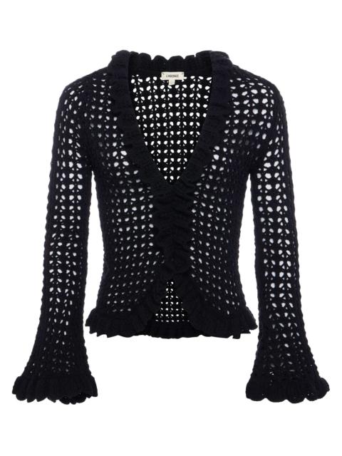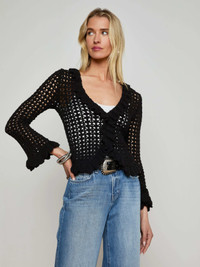 Summer, in a knit. The ultra sweet Solaris crocheted cardigan features ‘70s inspired bell sleeves with ruffled cuffs. She’s the lightweight layer you’ll want to wear all season. Throw it on over a bikini or pair it with a camisole and jean shorts. Style No. 80013BKT-BLAC DETAILS & FIT - Model Details: Height 5’9.5" | Bust 32" | Waist 24" | Hips 35" | Shoe 8 | Wearing Size XS - About 20" From Shoulder to Hem - Sleeve Length: 22.25" MATERIALS & CARE Composition - 70% Cotton 30% Rayon - Imported