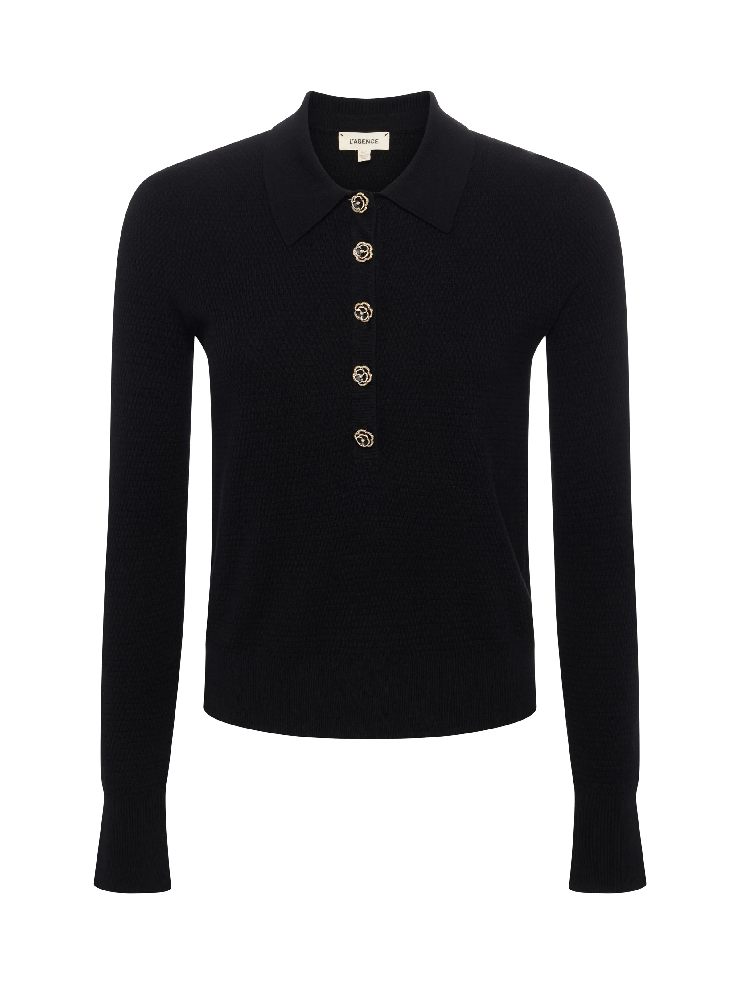 The L’AGENCE essential long sleeve knit and one of our fashion director’s favorite closet heroes. Now in a versatile black accentuated with floral buttons. • Premium knit with a hint of silk • Henley placket • Slim fit • Long sleeves with extended cuffs • Enamel and crystal orchid buttons Style No. 8983PSO-BLJW DETAILS & FIT - Model Details: Height 5'10" | Bust 32" | Waist 24'' | Hips 34.5'' | Wearing Size XS - About 22" From Shoulder to Hem - Sleeve Length: 23.8" MATERIALS & CARE Composition - 70% Cotton 20% Nylon 10% Silk - Imported Care - Hand wash - Cold water - Do not dry clean - No bleach - Lay flat to dry - No tumble dry - Cool iron on reverse when needed