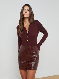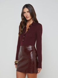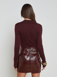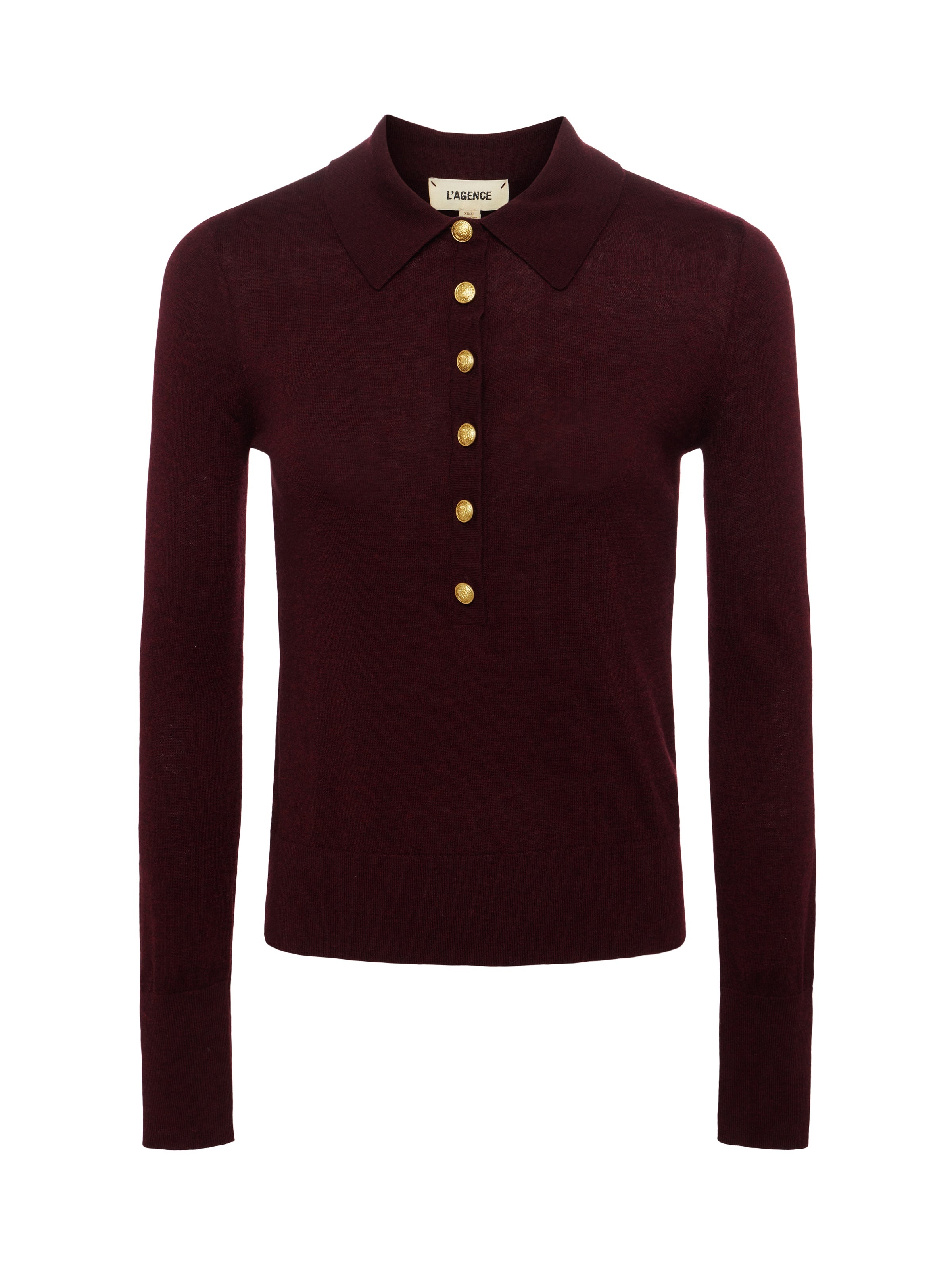 The L’AGENCE essential long sleeve knit and one of our fashion director’s favorite closet heroes. Now in an on-trend dark red. • Premium knit with a hint of wool • Henley placket • Slim fit • Long sleeves with extended cuffs • Embossed dome buttons Style No. 8876PQH-DKSG DETAILS & FIT - Model Details: Height 5'10" | Bust 32" | Waist 24'' | Hips 34.5'' | Wearing Size XS - About 22" From Shoulder to Hem - Sleeve Length: 23.8" MATERIALS & CARE Composition - 57% Nylon 19% Polyester 15% Acrylic 9% Wool - Imported Care - Hand wash - Cold water - Do not dry clean - No bleach - Lay flat to dry - No tumble dry - Cool iron on reverse when needed