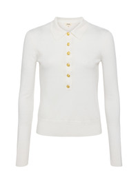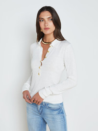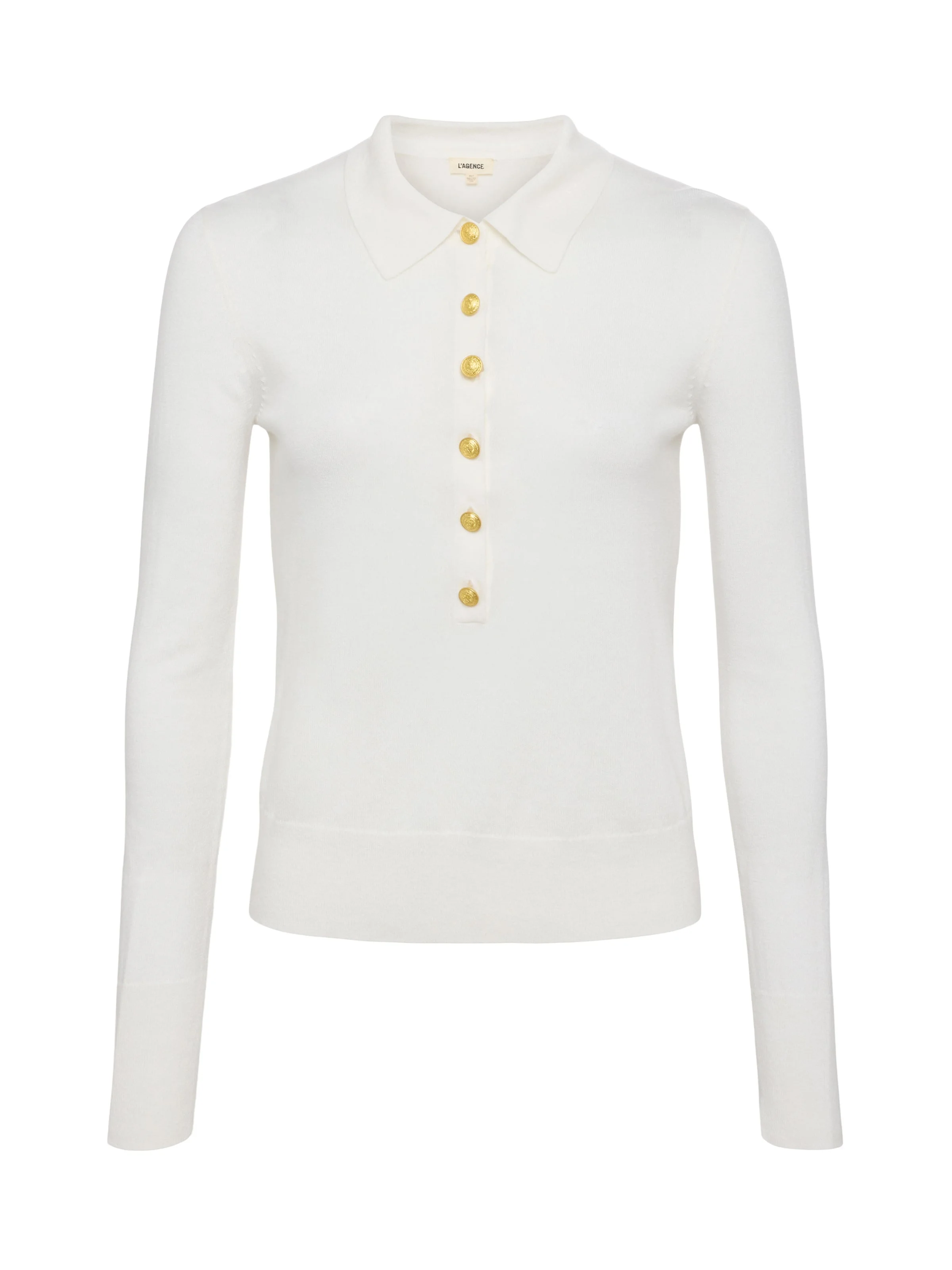 The L’AGENCE essential long sleeve knit and one of our fashion director’s favorite closet heroes. Now in a timeless white. • Premium knit with a hint of silk • Henley placket • Slim fit • Long sleeves with extended cuffs • Embossed dome buttons Style No. 8876PSO-WHGD DETAILS & FIT - Model Details: Height 5'10" | Bust 32" | Waist 24'' | Hips 34.5'' | Wearing Size XS - About 22" From Shoulder to Hem - Sleeve Length: 23.8" MATERIALS & CARE Composition - 70% Cotton 20% Nylon 10% Silk - Imported Care - Hand wash - Cold water - Do not dry clean - No bleach - Lay flat to dry - No tumble dry - Cool iron on reverse when needed