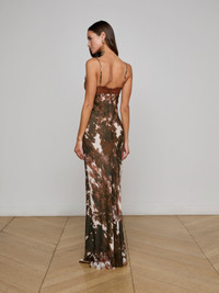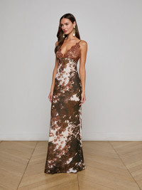 Style No. 61396COU-COWP DETAILS & FIT - Model Details: Height 5'10" | Bust 32" | Waist 23.5" | Hips 34.5" | Wearing Size 2 - About 59.6" From Shoulder to Hem MATERIALS & CARE Composition - 100% Silk - Imported Care - Dry clean only - Do not wash - No bleach - No tumble dry - Low iron if needed