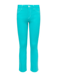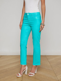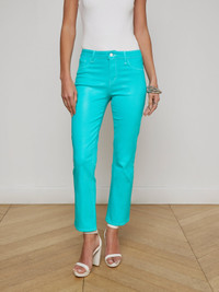 A slim fit from hip to knee finishes in a beautifully proportioned micro bootcut. Now in vibrant pool blue. • Leather-look coated denim • High-rise cropped micro bootcut • Faux front pockets • Functional back pockets • Zip fly and button closure Style No. 2840PDDCM-PBWC DETAILS & FIT - Model Details: Height 5'10" | Bust 32" | Waist 24" | Hips 34.5" | Wearing Size 26 - Rise: 9.75" - Inseam: 27" - Leg Opening: 15.5" MATERIALS & CARE Composition - 86% Cotton 11% Elastane 3% Spandex - Made in Los Angeles Care - Spot wash disinfect - Dry clean only