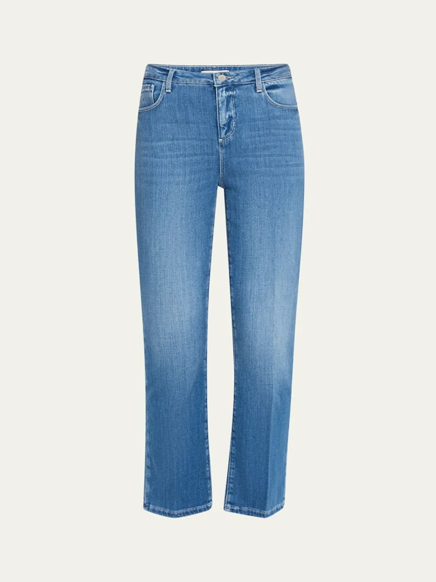 L'Agence "Tati" bootcut jeans in faded medium-wash denim Approx. 27" inseam High rise Five-pocket style Fitted through the hip and thigh Cropped length Button/zip fly; belt loops Cotton/polyester/spandex Made in USA Online Inquiries: BGS21_T6U3N| Store Inquiries: #4693238