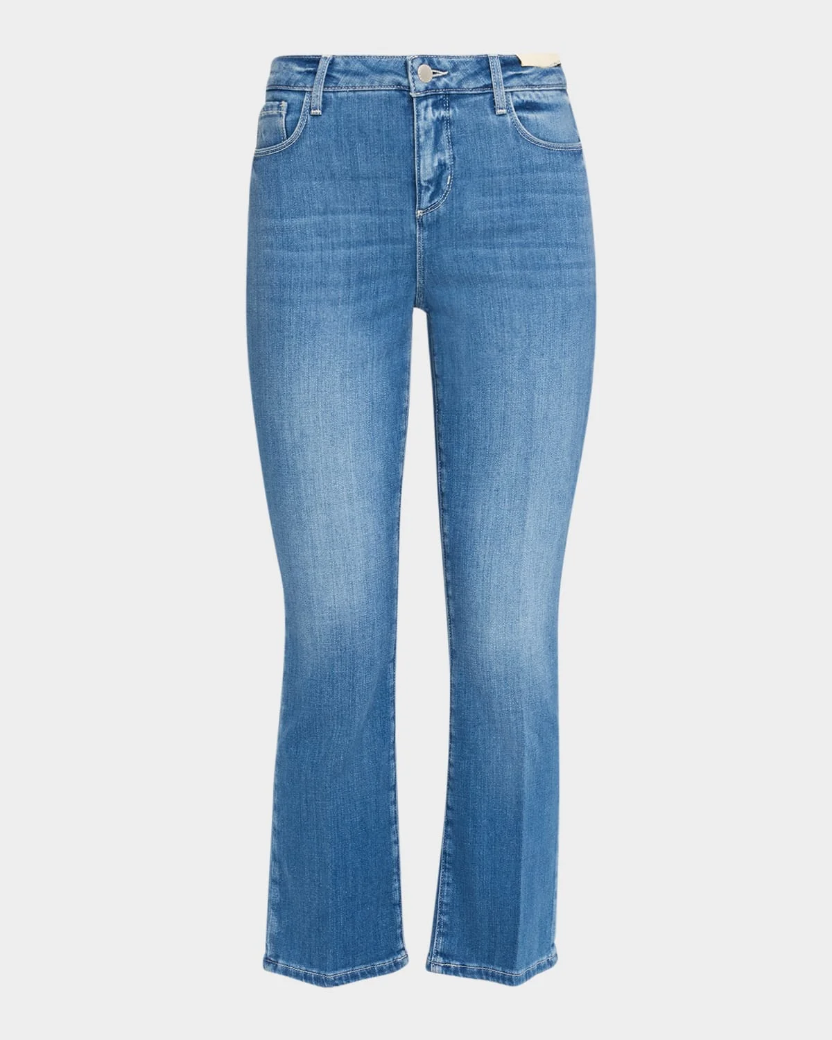 L'Agence "Tati" bootcut jeans in faded mediumwash denim Approx. 27" inseam High rise Fivepocket style Fitted through the hip and thigh Cropped length Button/zip fly; belt loops Cotton/polyester/spandex Made in USA