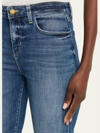 L'Agence "Tati" micro bootcut jeans in faded lightwash denim Approx. 9.8" rise; 27" inseam High rise Fivepocket style Fitted through the hips and thighs Cropped length Button/zip fly; belt loops Repreve/cotton/spandex Made in USA