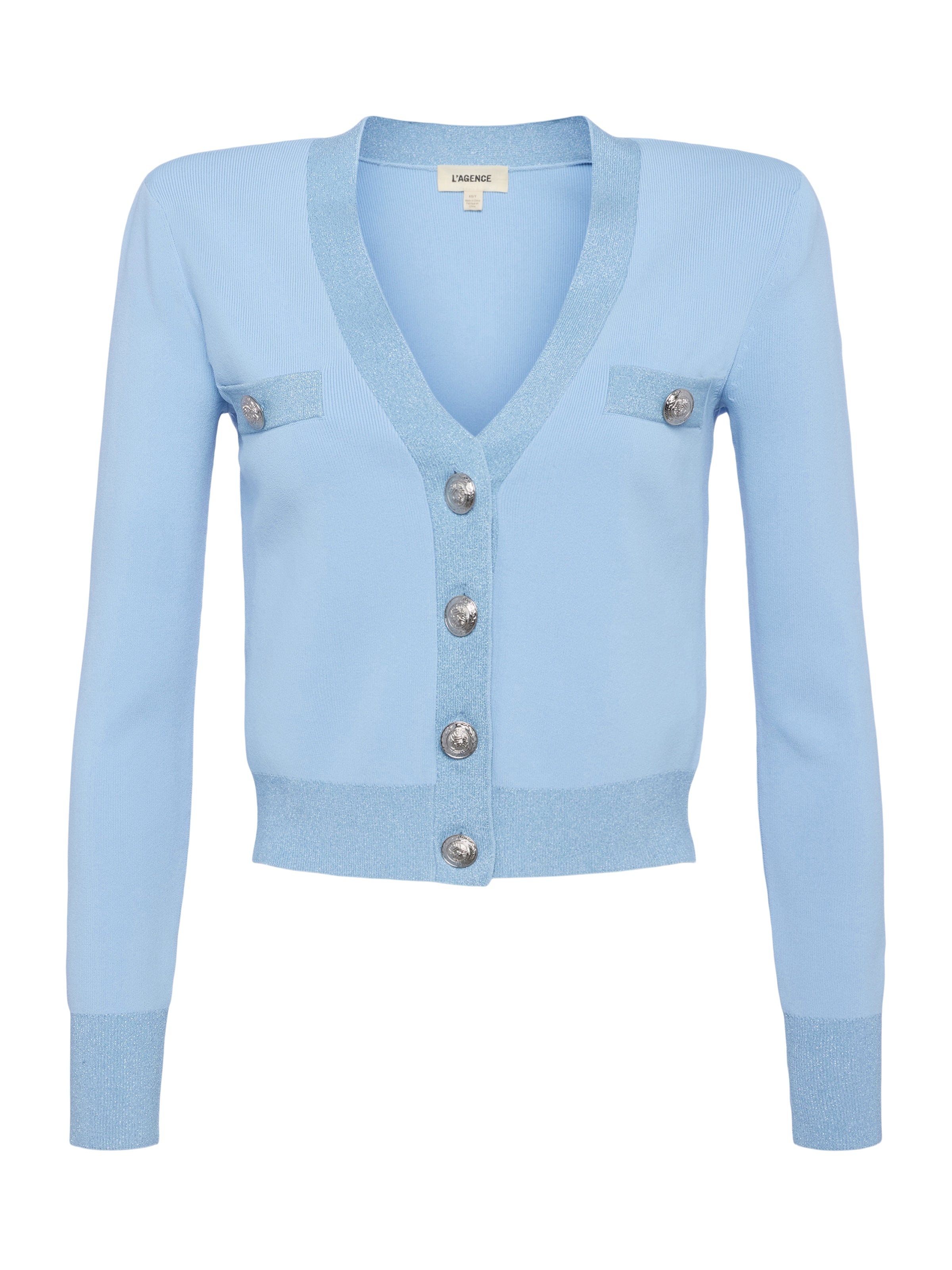 Our chic Parisian-inspired cardigan, now in blue. Wear the Taya as a top or second layer all season, every season. • Lightweight knit with metallic trim • Strong shoulders • Cropped length • Faux welt pockets • Embossed dome button closures Style No. 8991NXC2-BFLN DETAILS & FIT - Model Details: Height 5'9" | Bust 32" | Waist 24" | Hips 34" | Wearing Size XS - About 19.6" From Shoulder to Hem - Sleeve Length: 22.75" MATERIALS & CARE Composition - 52% Rayon 42% Nylon 3% Polyester 2% Spandex 1% Metallic - Imported Care - Dry clean only