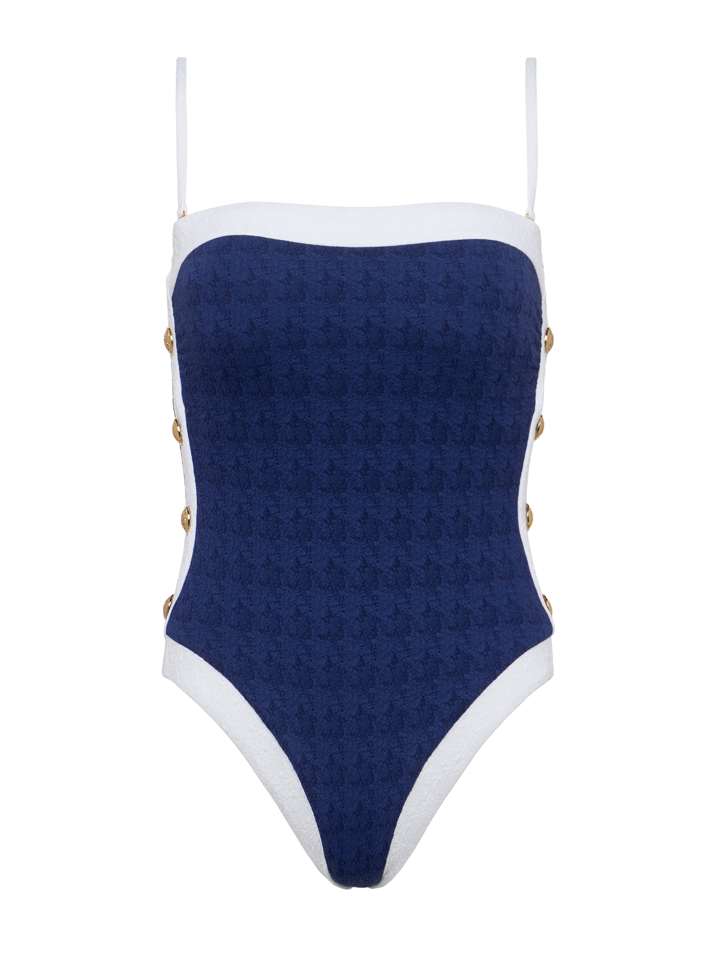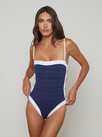 The one-piece swimsuit has never looked so chic. A subtle houndstooth print lends effortless sophistication and gold button accents add a hint of glamour. • Water-safe textured boucle fabric • Additional layer of lining for shape and support • High-leg cut • Removable cups • Adjustable & removable straps Style No. LG5AM11-MWGB DETAILS & FIT - Model Details: Height 5'10" | Bust 32" | Waist 24" | Hips 34.5" | Wearing Size XS MATERIALS & CARE Composition - 93% Nylon 7% Elastane - Imported Care - Hand wash