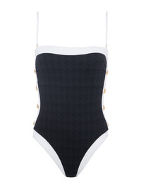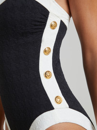 The one-piece swimsuit has never looked so chic. Bold contrast trim lends effortless sophistication and gold button accents add a hint of glamour. • Water safe textured boucle fabric • Additional layer of lining for shape and support • High leg cut • Removable cups • Adjustable & removable straps Style No. LG5AM11-BKWT DETAILS & FIT - Model Details: Height 5'10" | Bust 32" | Waist 24" | Hips 34.5" | Wearing Size XS - Adjustable / Removable Straps - Removable Cups MATERIALS & CARE Composition - 93% Nylon 7% Spandex - Imported Care - Hand wash