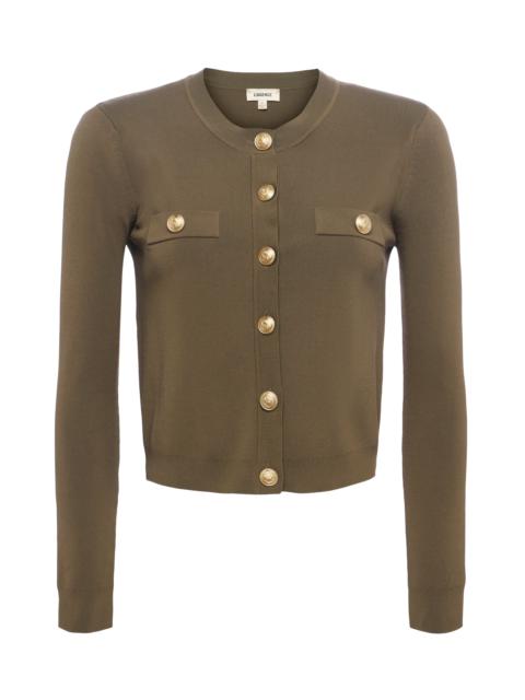 A timeless cropped crew-neck cardigan in true black. Supple premium knit style softly drapes from strong shoulders to trim cropped waist. Includes welt pocket accents detailed with luxe gold embossed-domed buttons, and matching front button closure. Style No. 8928NXT2-BLAC DETAILS & FIT - Model Details: Height: 5’10" | Bust 34” | Waist 24" | Hips 35” | Wearing Size XS - About 19" From Shoulder to Hem - Sleeve Length: 23.25" MATERIALS & CARE Composition - 80% Rayon 18% Nylon 2% Spandex - Imported Care - Dry clean only