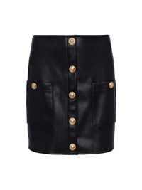 A sleek miniskirt offered in black faux leather. Shaped waist hugs natural waist before design falls straight to high thigh. Gleaming gold embossed-dome accent buttons detail patch pockets and faux front button placket. Hidden back zip closure. Style No. 3384ZST-BLAC DETAILS & FIT - Model Details: Height: 5' 8'’ | Bust 32” | Waist 23" | Hips 34” | Wearing Size 2 - About 16" From Waist to Hem MATERIALS & CARE Composition - 50% Polyurethane 50% Polyester - Imported Care - Dry clean only
