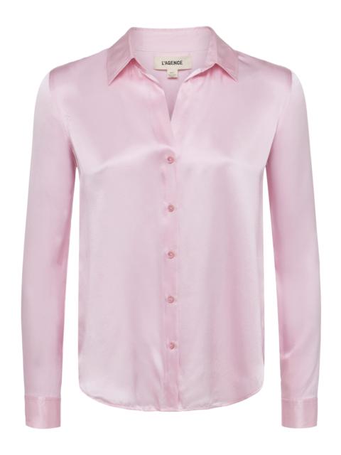 Style No. 40223CLZ-DMLB DETAILS & FIT - Model Details: Height 5'9" | Bust 30" | Waist 24" | Hips 34" | Wearing Size XS - About 26.5" From Shoulder to Hem - Sleeve Length: 24" MATERIALS & CARE Composition - 100% Silk - Imported Care - Dry clean only - Do not wash - No bleach - No tumble dry - Low iron if needed