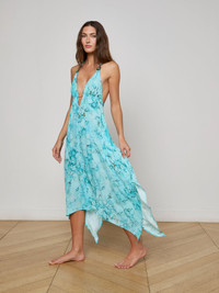 Breezy and beautiful, the Umma marble print cover-up dress features a plunging neckline, a flowy handkerchief hem, and silver and turquoise embellishments at the straps—perfect for poolside glam. • Viscose crepe • Unlined • Side pockets • Halter and back ties Style No. LG5TD29-TURQ DETAILS & FIT - Model Details: Height 5'10" | Bust 32" | Waist 24" | Hips 34.5" | Wearing Size XS MATERIALS & CARE Composition - 100% Viscose - Imported