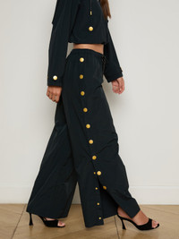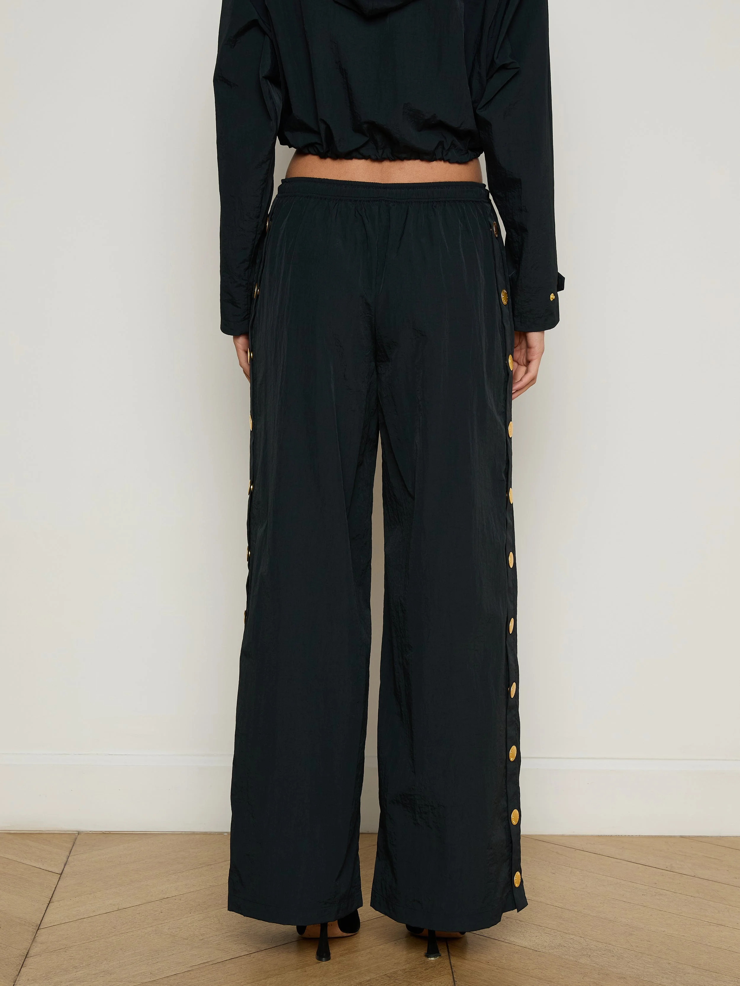 Elevate the everyday with the Valkyrie pant. Featuring a bold contrast stripe and gold snap buttons down its sides, this drawstring pant blends sporty energy with standout style. • Crepe nylon with a water-repellent finish • Elastic and drawstring waist • Side pockets • Functional snap buttons Style No. 2959NWB-BLAC DETAILS & FIT - Rise: 10.25" - Inseam: 31.5" - Leg Opening: 13.25" MATERIALS & CARE Composition - 100% Nylon - Imported