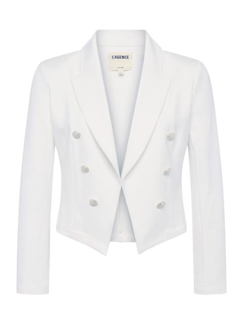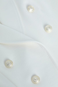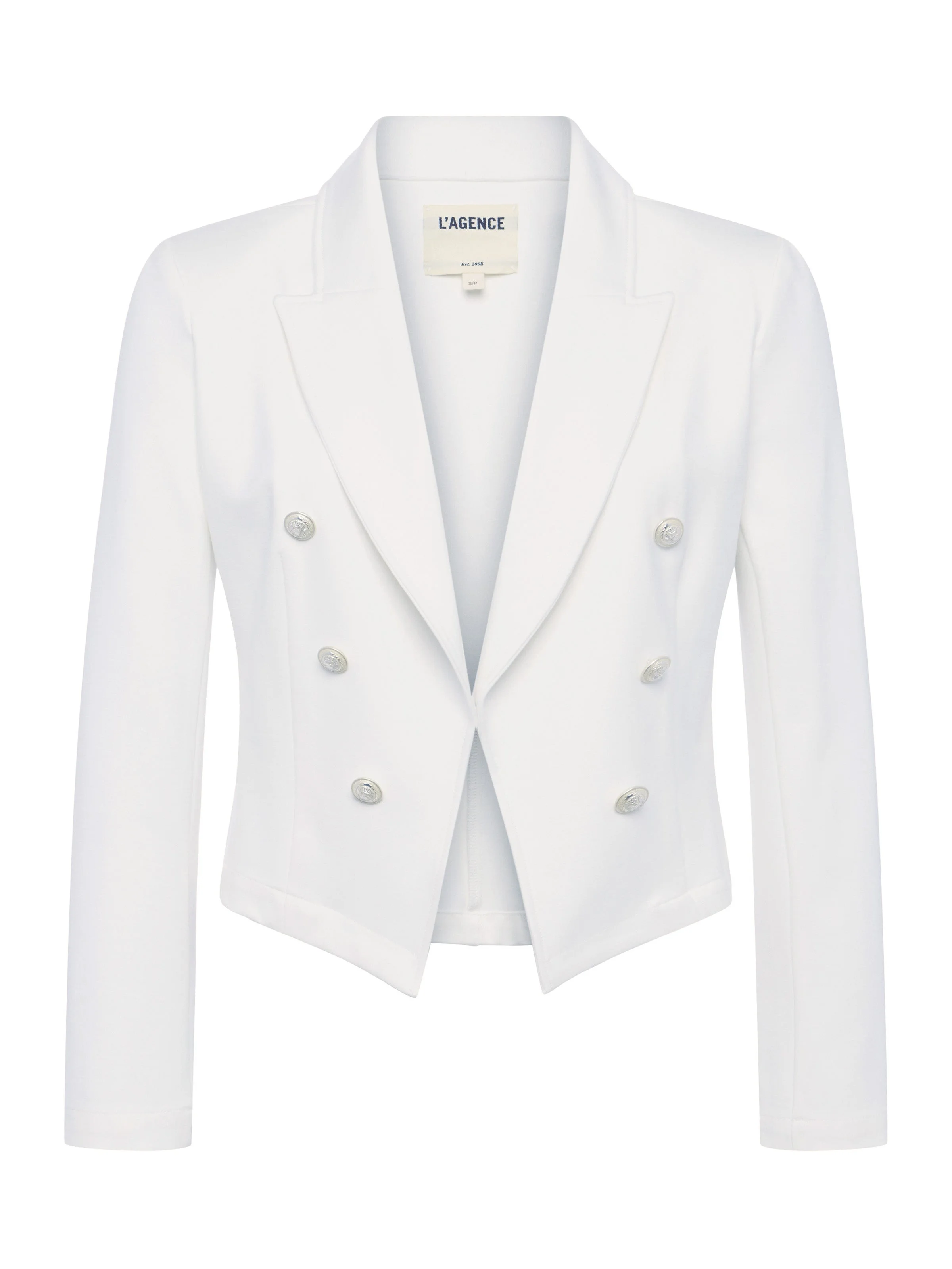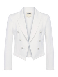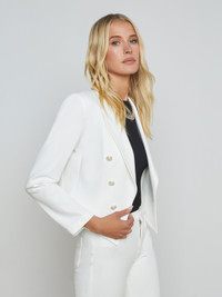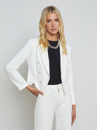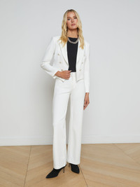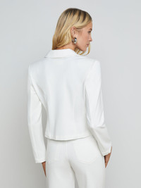 The ultimate cropped blazer with a tapered slim fit. This season the Wayne is back in versatile ivory. • Ponte fabric • No closures • Strong shoulder • Angled hem Style No. 1750APT-IVOR DETAILS & FIT - Model Details: Height 5'9" | Bust 32" | Waist 24" | Hips 34" | Wearing Size XS - About 21.5" From Shoulder to Hem - Sleeve Length: 23.5" MATERIALS & CARE Composition - 82% Viscose 14% Nylon 4% Spandex - Made in Los Angeles