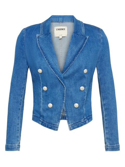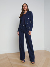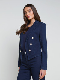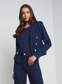 The ultimate cropped denim blazer with a tapered slim fit. This season the Wayne is back in a dark indigo wash. • Stretch denim • Open-front style • Strong shoulder • Angled hem • Embossed dome buttons Style No. 1698RDM-PLMN DETAILS & FIT - Model Details: Height 5’9.5" | Bust 32" | Waist 24" | Hips 35" | Wearing Size XS - About 21.5" From Shoulder to Hem - Sleeve Length: 23.5" MATERIALS & CARE Composition - 94% Cotton 5% Polyester 1% Spandex - Made in Los Angeles Care - Machine wash