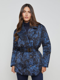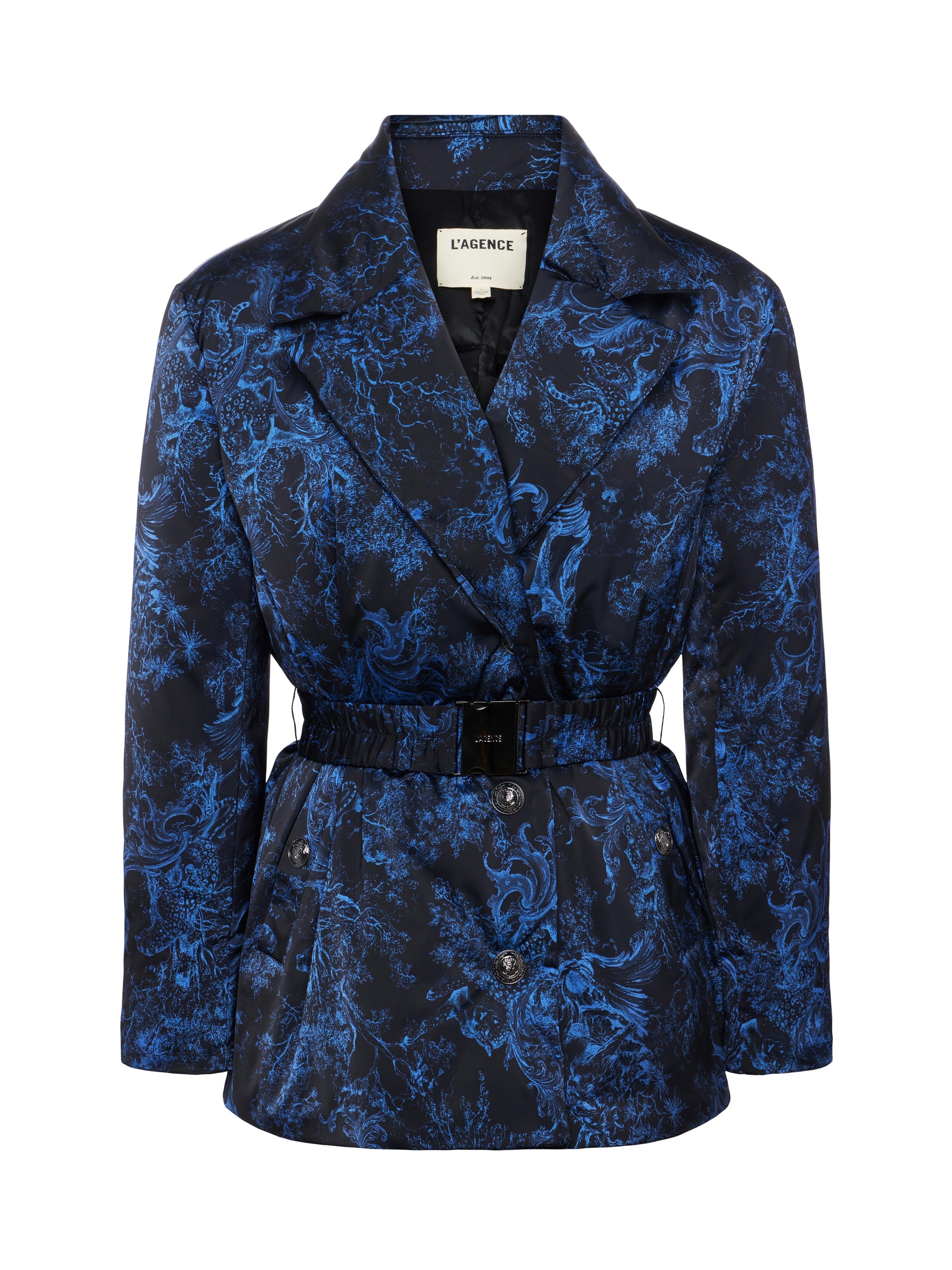 The shape of a blazer meets the warmth of a puffer jacket, featuring a waist belt for added definition. • 90% down, 10% feather fill • Single-breasted front closure • Elasticized belt with L’AGENCE buckle • Front welt pockets • Embossed dome buttons Style No. 1836RSB-BROT DETAILS & FIT - Model Details: Height 5'10" | Bust 32" | Waist 24'' | Hips 34.5'' | Wearing Size XS - About 29.75" From Shoulder to Hem - Sleeve Length: 32" MATERIALS & CARE Composition - 100% Polyester - Imported Care - Dry clean only