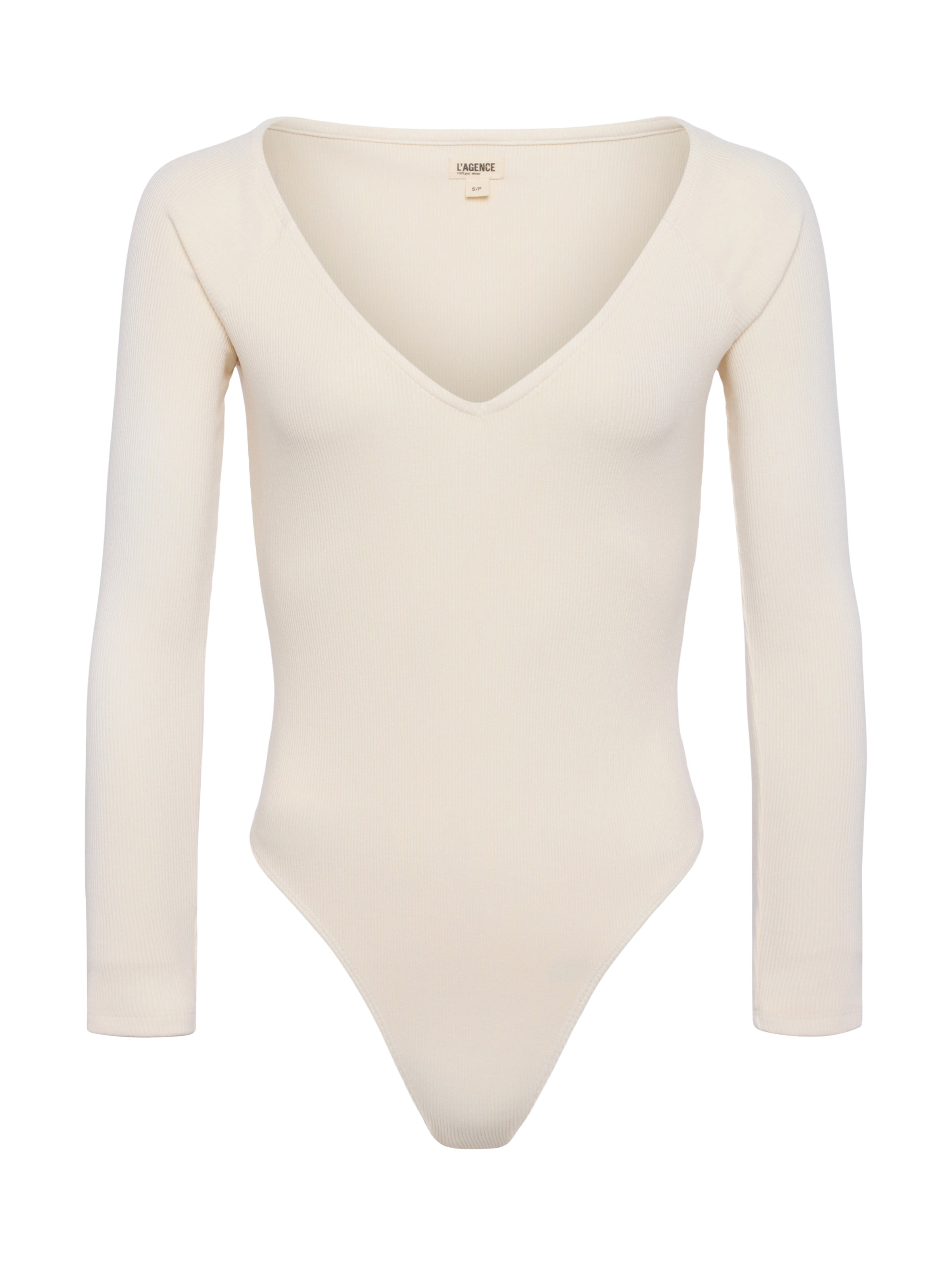 A deep V-neck cuts a beautifully elegant shape wide across the shoulders. Now in ivory. • Cotton jersey • Wide V-neckline • 2-snap gusset closure Style No. 5730CMR-IVOR DETAILS & FIT - Model Details: Height 5'10.5" | Bust 33" | Waist 24" | Hips 34" | Wearing Size XS - About 27.5" From Shoulder to Bottom - Sleeve Length: 23.5" MATERIALS & CARE Composition - 47% Cotton 47% Modal 6% Spandex - Made in Los Angeles Care - Hand wash