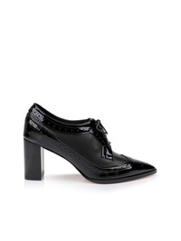The modern version of a heeled Oxford in black, with a substantial block heel for ease of wear. • Calf and patent leather upper • Leather lining and sole • Pointed toe • Lace-up front • Block heel Style No. 9TILA1514-BLPA DETAILS & FIT - Heel Height: 2.95" / 75mm MATERIALS & CARE Composition - 100% Calf Leather - Imported