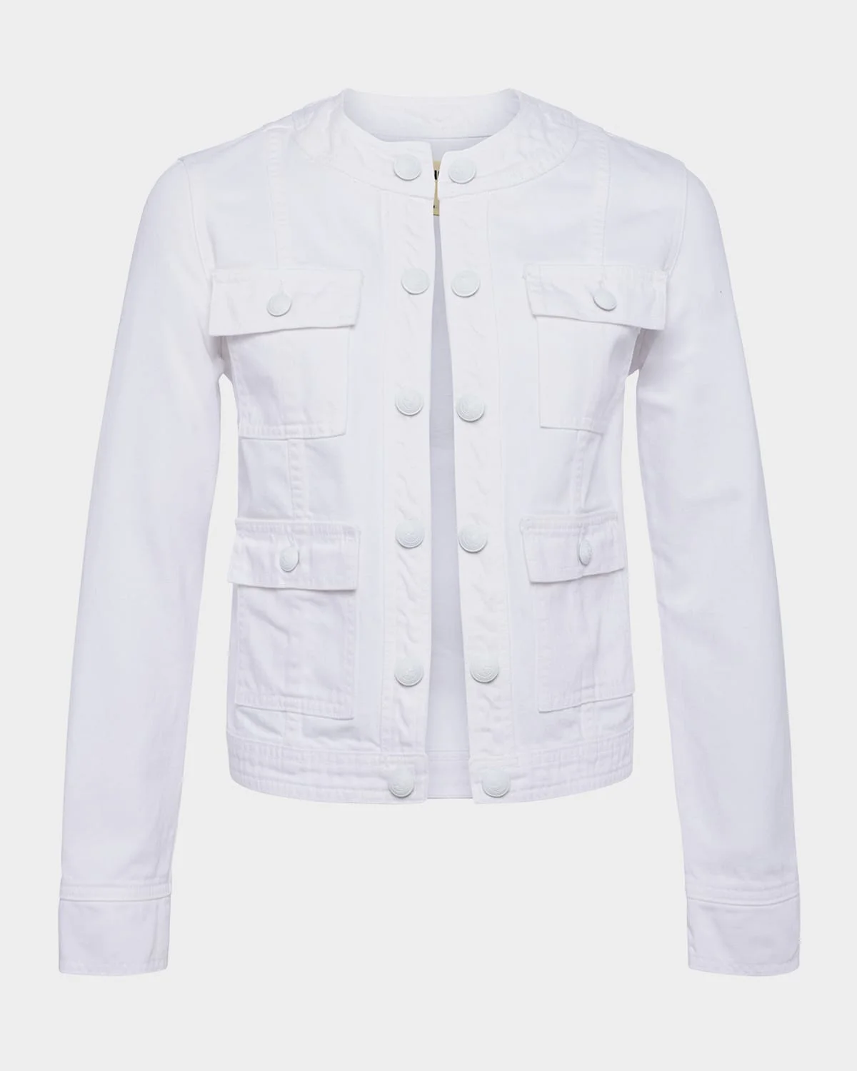 L'Agence "Yari" jacket in colored denim Round neckline Long sleeves with button cuffs Dual chest and hip pockets Classic fit Hem sits at the hip Openfront Cotton Made in USA