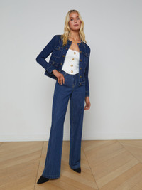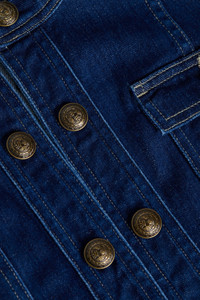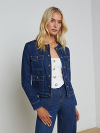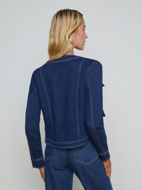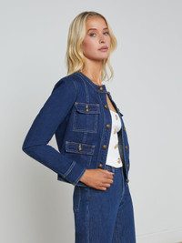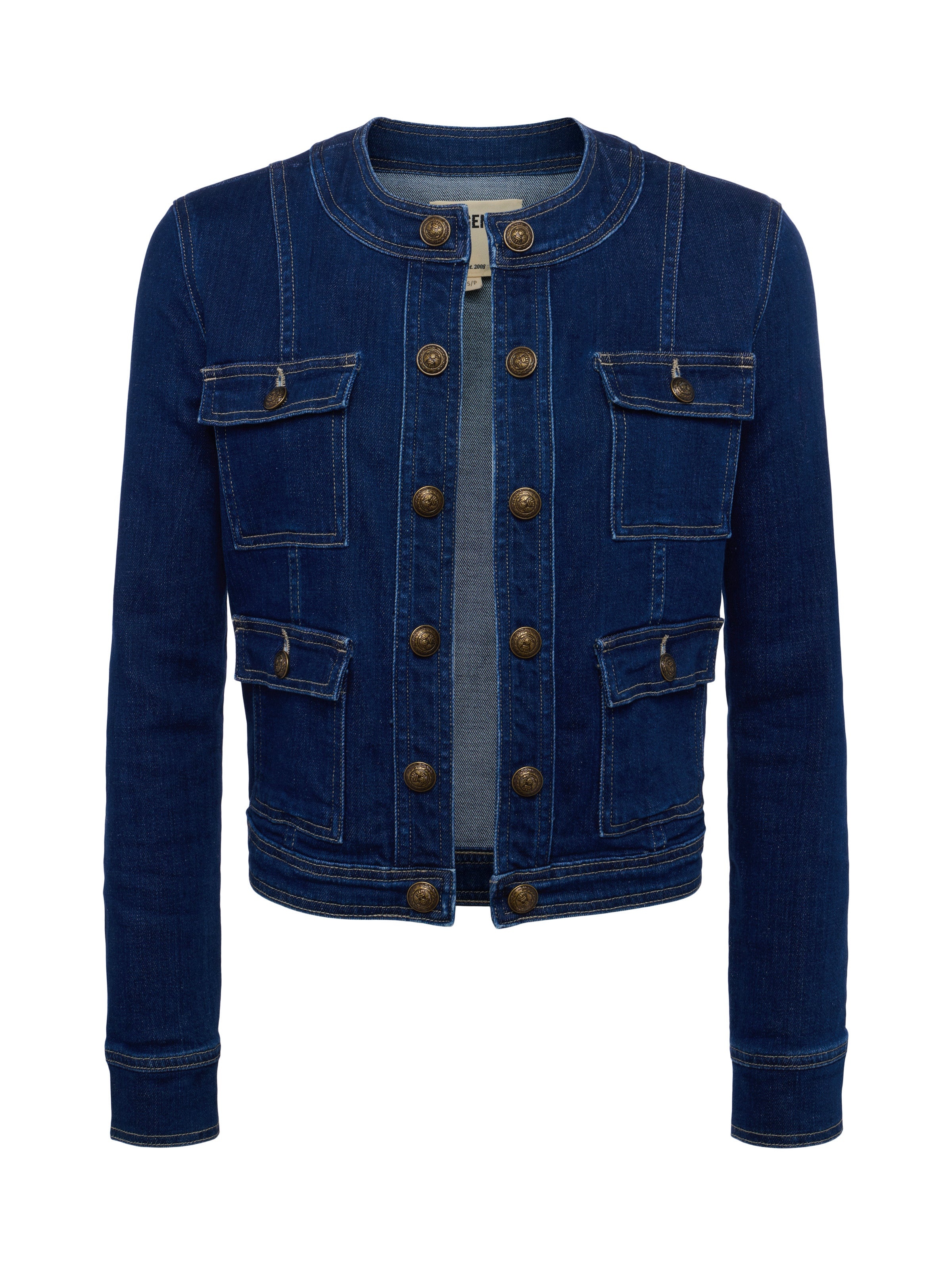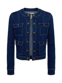 A jean jacket with the polish of a blazer. Our ultra comfortable stretch denim is back in a deep indigo wash. • Premium stretch denim • Open-front style • Collarless design • 4 flap pockets • Embossed dome buttons Style No. 1646RDM-BISH DETAILS & FIT - Model Details: Height 5'9" | Bust 32" | Waist 24" | Hips 34" | Wearing Size XS - About 21.5" From Shoulder to Hem - Sleeve Length: 23" MATERIALS & CARE Composition - 94% Cotton 5% Polyester 1% Spandex - Imported