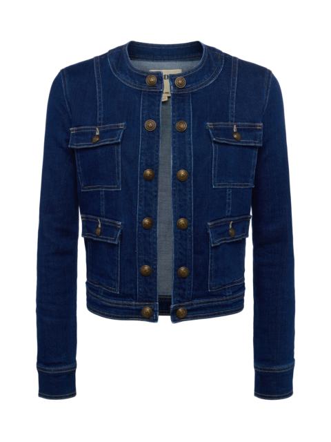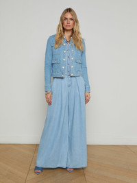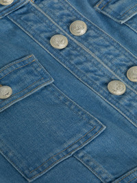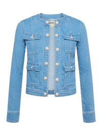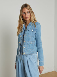 A jean jacket with the polish of a blazer, now in a light wash. • Subtle stretch denim • No closures • Flap pockets • Embossed dome buttons Style No. 1646RDM-EUCL DETAILS & FIT - Model Details: Height 5'10.5" | Bust 33" | Waist 24" | Hips 34" | Wearing Size XS - About 21.5" From Shoulder to Hem - Sleeve Length: 23" MATERIALS & CARE Composition - 94% Cotton 5% Polyester 1% Spandex - Imported Care - Machine wash