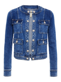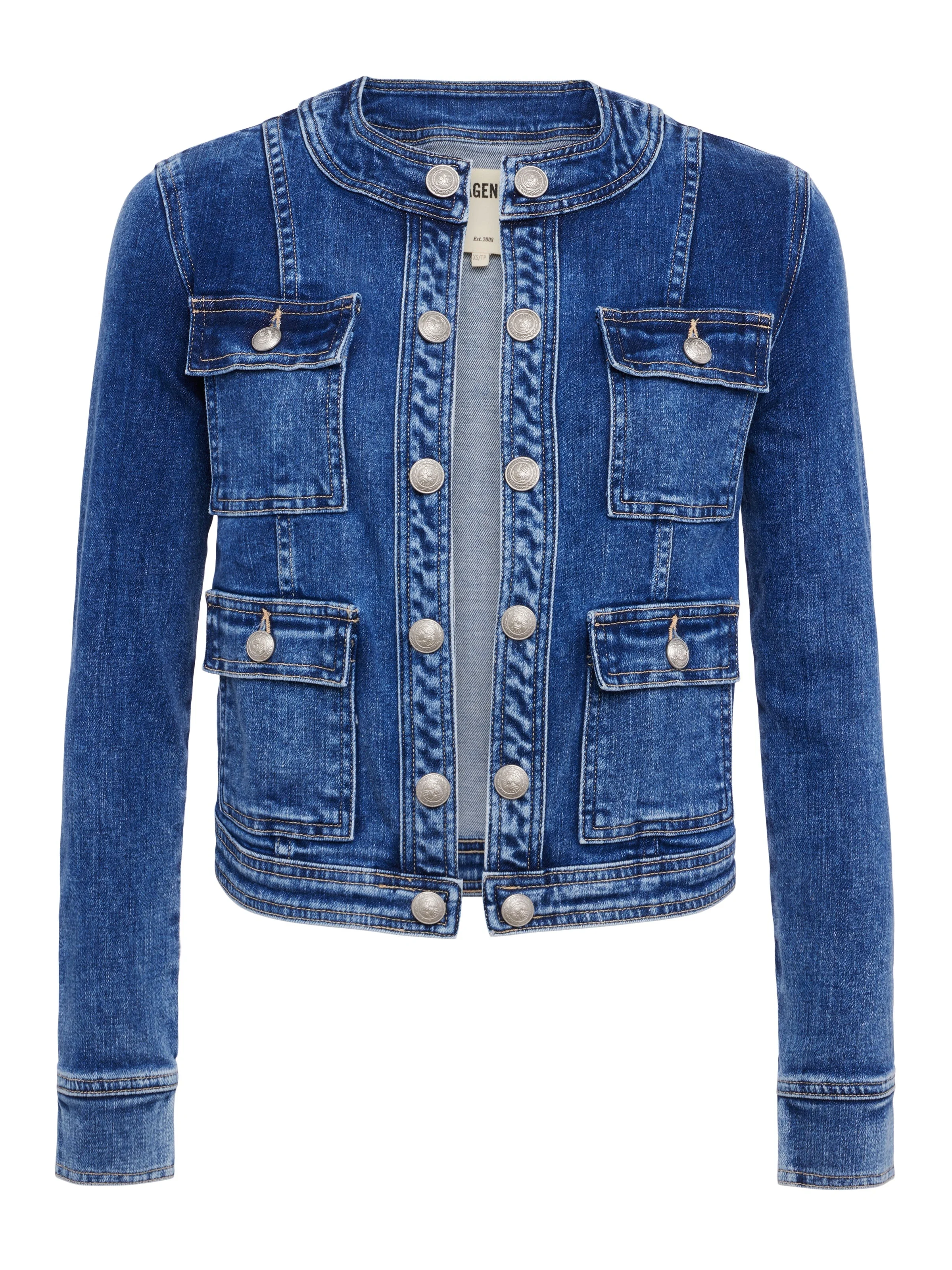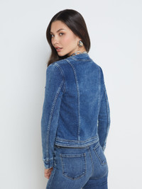 A classic collarless jacket in medium-blue premium stretch denim with subtle aging. Meticulous workmanship echoed in contrast-stitched banded edges and flap-patch pockets. Subtly shaped waist creates a flattering silhouette. With silver embossed-dome accent buttons. No closures. Style No. 1646RDM-RHOD DETAILS & FIT - Model Details: Height 5’10" | Bust 32” | Waist 23.5" | Hips 34.5” | Wearing Size XS - About 21.5" From Shoulder to Hem - Sleeve Length: 23" MATERIALS & CARE Composition - 94% Cotton 5% Polyester 1% Spandex - Made in Los Angeles Care - Machine wash