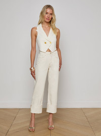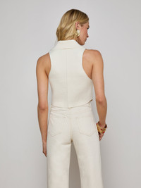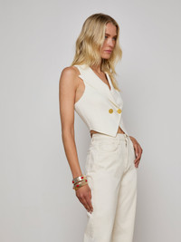 A fresh take on minimalist glamour. Lion head buttons and a wide lapel elevate this little knit vest. Wear it as a top or layer it over a button-down shirt. • Structured knit • Lion head button closure • Cropped length Style No. 80086FBA2-IVGO DETAILS & FIT - Model Details: Height 5'9" | Bust 32" | Waist 24" | Hips 34" | Wearing Size XS - About 19.6" From Shoulder to Hem MATERIALS & CARE Composition - 47% Cotton 38% Acrylic 15% Nylon - Imported Care - Dry clean only - Do not wash - No bleach - No tumble dry - Cool iron