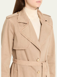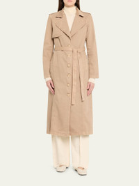L'Agence "Zavia" sophisticated denim trench coat elevated with a self-tie belt for a cinched waist Oversized notch lapels Single-breasted front Epaulets; lightly padded shoulders Long sleeves Side pockets Classic fit Hem falls below the knee Button-front Cotton Machine wash Made in USA Online Inquiries: BGS21_T6WFW| Store Inquiries: #5050875