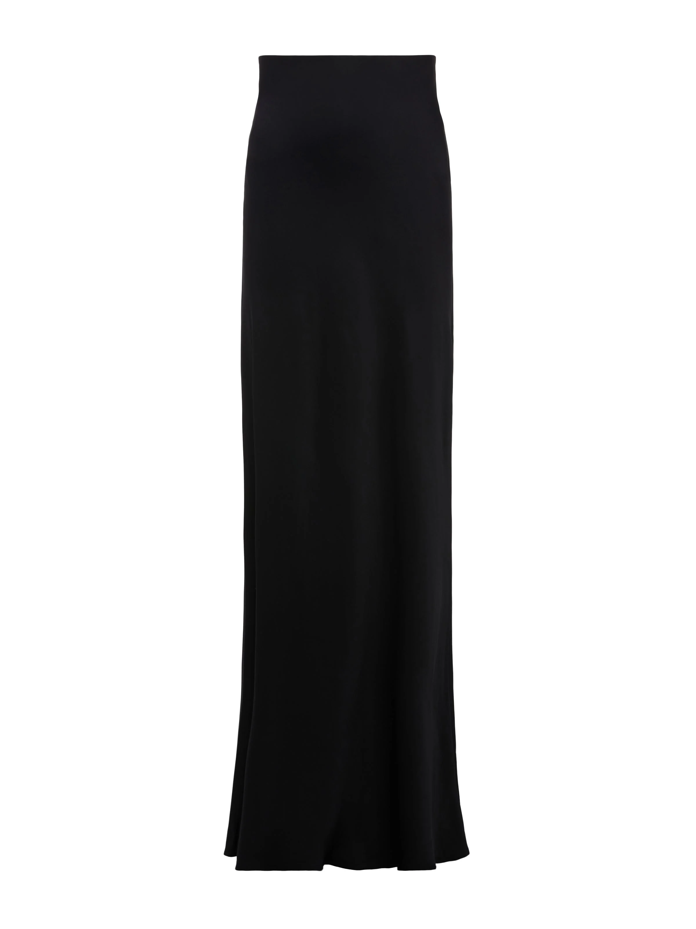 A stunning, understated maxi skirt in pure black. Bias-cut, silk-like fabric falls in a subtle, lustrous cling over the figure, enhancing and elongating the silhouette. Smooth elastic waist with no closures. Style No. 3364PLY-BLAC DETAILS & FIT - Model Details: Height 5’10" | Bust 34” | Waist 24" | Hips 35” | Wearing Size XS - About 43" From Waist to Hem MATERIALS & CARE Composition - 55% Rayon, 45% Viscose - Imported