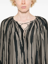 abstract-print blouse Highlights - Dark grey/gold-tone - Satin finish - Plisse effect - Abstract pattern print - Gathered neckline - Front tie fastening - Long raglan sleeves - Lettuce hem Imported Composition Polyester 100%, Brass 100% SIZE & FIT Model measurements Height 5 ft 9 in(1.75 m) Bust/Chest 34.64 in(88 cm) Hips 36.61 in(93 cm) Waist 26.37 in(67 cm) FittingInformation Designed to be unstructured, offering a loose fit throughout The pleated construction on this piece allows for additional movement and flexibility in the fit This piece fits true to size – take your usual size