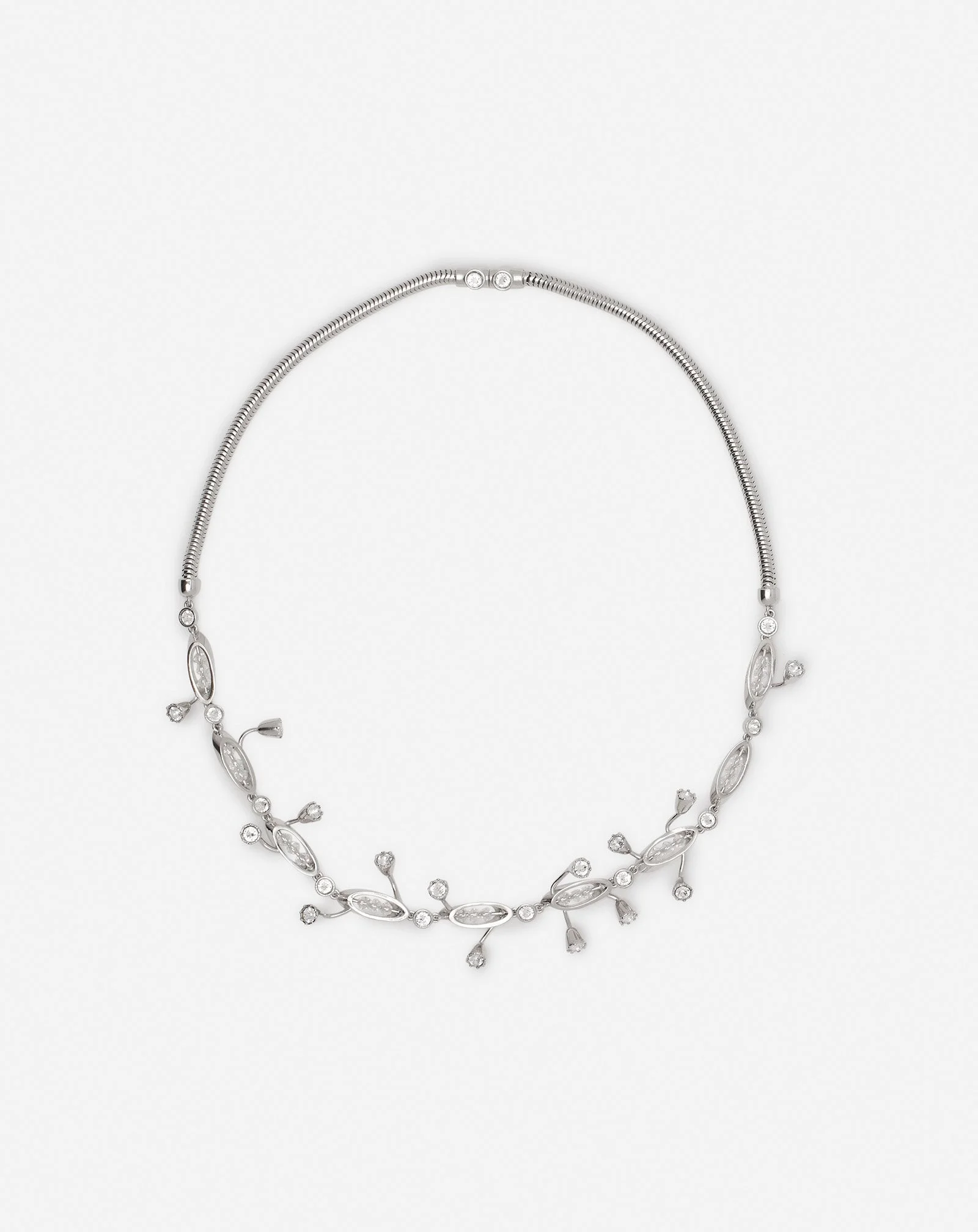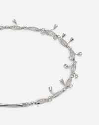 The Aede line bears a Greek name, which is inspired by sung poetry and is part of a foliage theme. This choker necklace with crystals is minimalist and perfect for your evening outfits. Details - Aede necklace - Details in the shape of small tree leaves adorned with crystals - Silver-plated metal finishes - Magnetic clasp - Made in Italy Composition - Main fabric : 100% brass SKU: AW-CJFNK1-VRFO-P25M2S2U