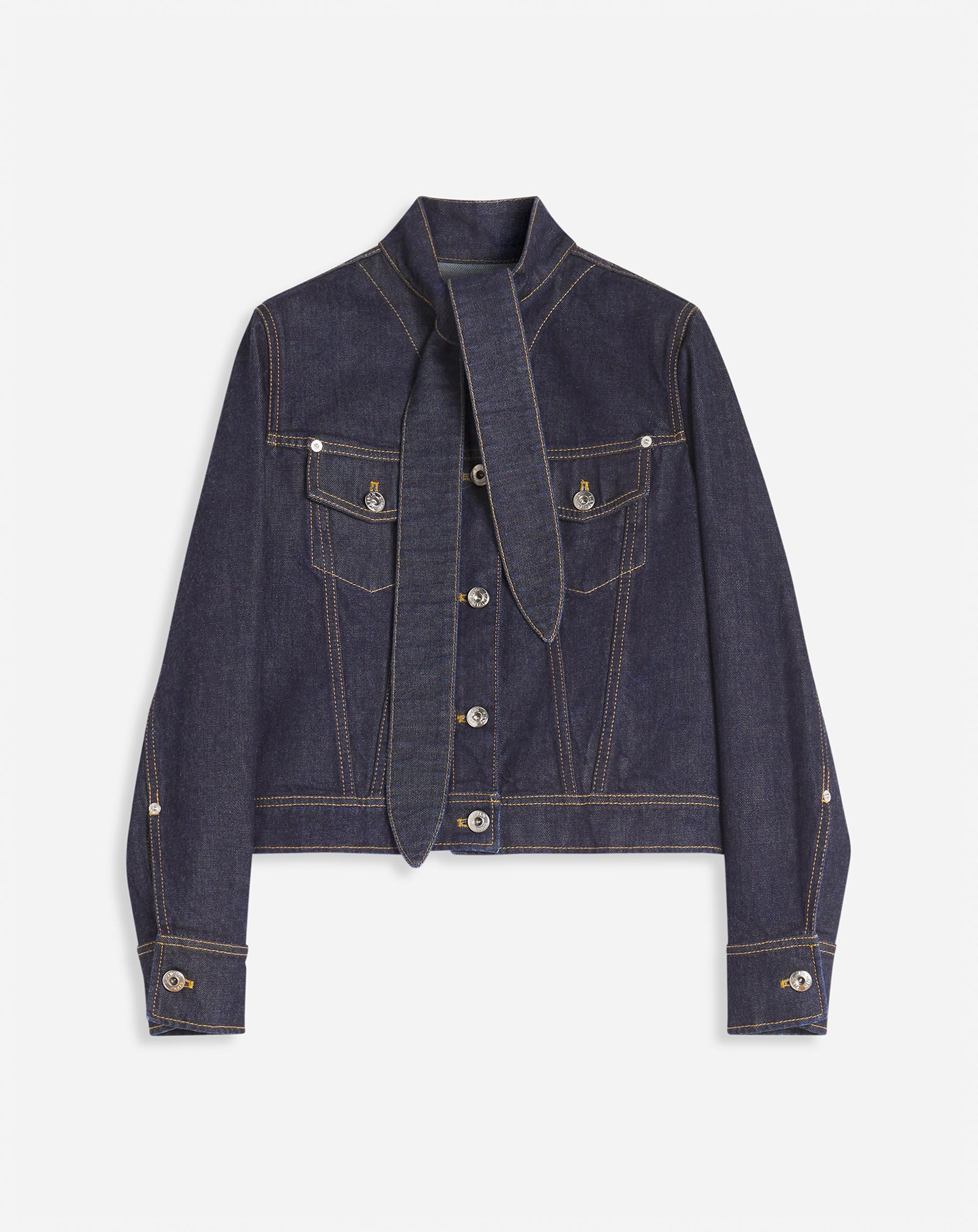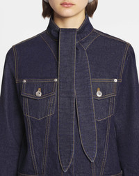 The collar of this jacket recalls the ribbon details that Jeanne Lanvin liked to add to her creations. It adds a feminine touch to this denim piece, perfect for a chic yet casual outfit. Details - Ascot collar jacket in denim - Fastening with metal buttons - Buttoned fastening on the cuffs - Patch pockets in front - Made in Italy Size & fit - This style fits true to size, take your normal size - For more information, please see our size guide. Composition - Main fabric : 100% cotton - Lining : 100% cotton knitted SKU: RW-JA0022-D021-H242936