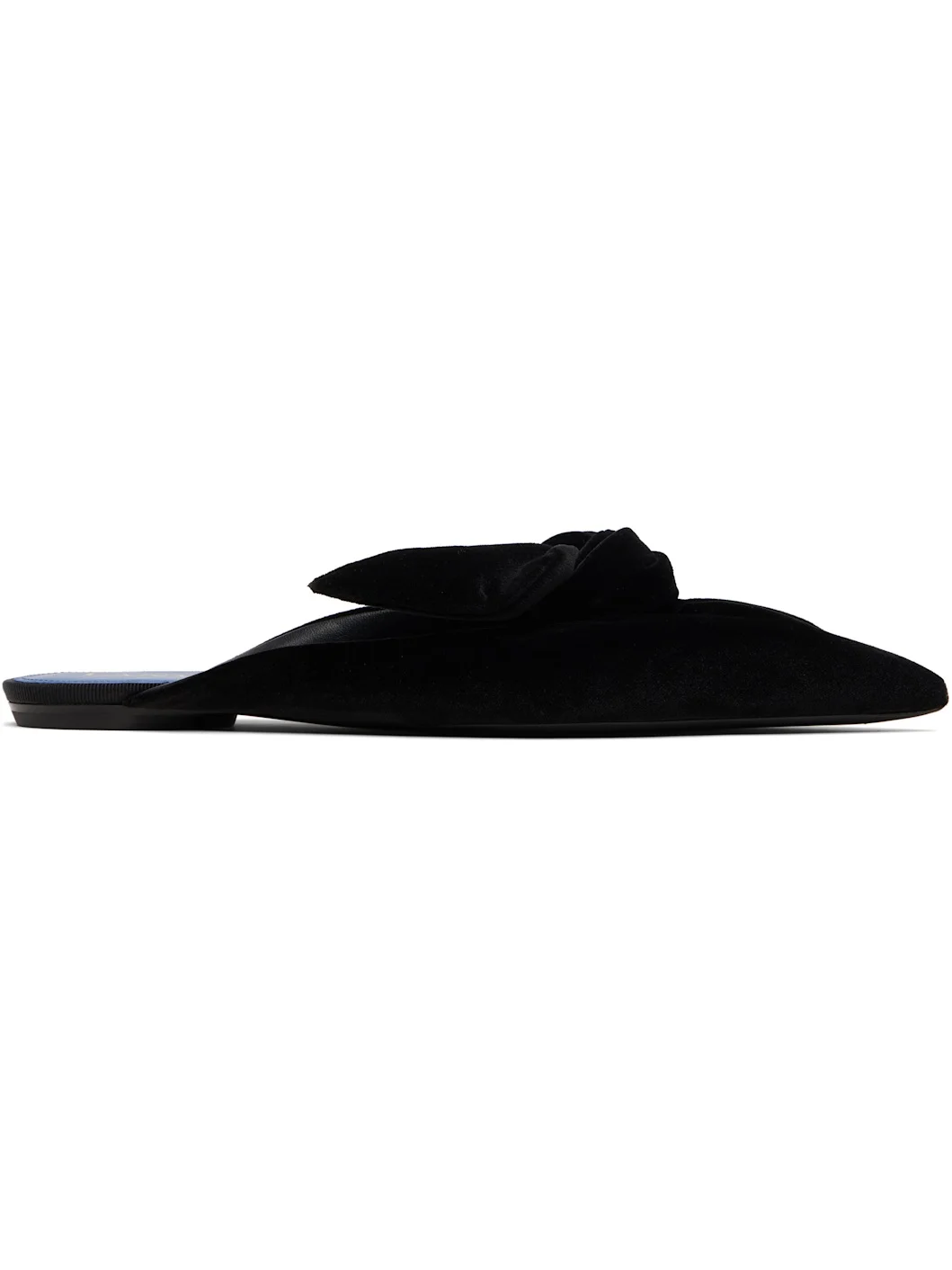 Velvet slip-on flats. · Pointed toe · Bow accent at vamp · Logo stamp at padded footbed · Buffed calfskin lining · Leather sole with rubber injection Supplier color: Black Upper: textile. Sole: leather, rubber. Made in Italy 252254F121000