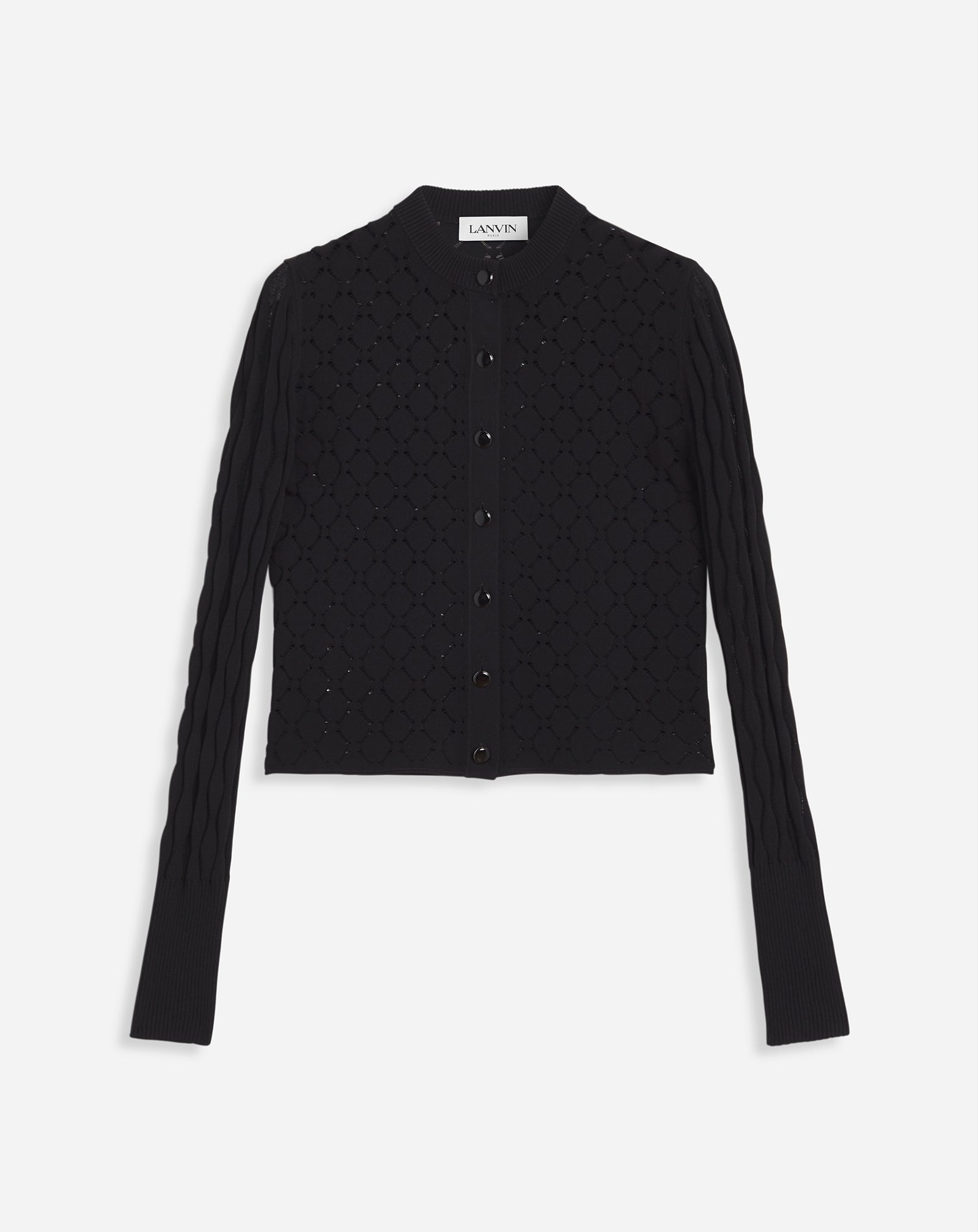 This cardigan enhances the feminine silhouette and can be worn as an ensemble with the matching tank top. The sophisticated knit creates a lace effect, with two different motifs for the body and arms. This very light material is also easy to care for. Details - Close-fitting round-neck cardigan - Slim fit and long sleeves - Two motifs in fine viscose lace knit - Tone-on-tone button fastening - Made in Turkey Size & fit - For more information, please see our size guide. Composition - Main fabric : 67% viscose knitted, 33% polyester knitted SKU: RW-CA0015-K024-P2410S
