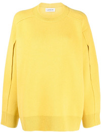 cape-back knitted jumper Lanvin’s inventive approach to knitwear is exemplified by this sunflower-yellow jumper. The wool and cashmere-blend construction is framed with split sleeves that create a cape-like effect. Highlights - Sunflower yellow - Virgin wool-cashmere blend - Cape design - Crew neck - Long slit sleeves - Ribbed cuffs and hem Imported Composition Virgin Wool 70%, Cashmere 30% SIZE & FIT Model measurements Height 5 ft 10 in(1.78 m) Bust/Chest 32.67 in(83 cm) Hips 35.43 in(90 cm) Waist 23.22 in(59 cm) FittingInformation Designed to be unstructured, offering a loose fit throughout Made with a midweight knit, this piece offers some stretch This piece fits true to size – take your usual size Washing instructions Hand Wash