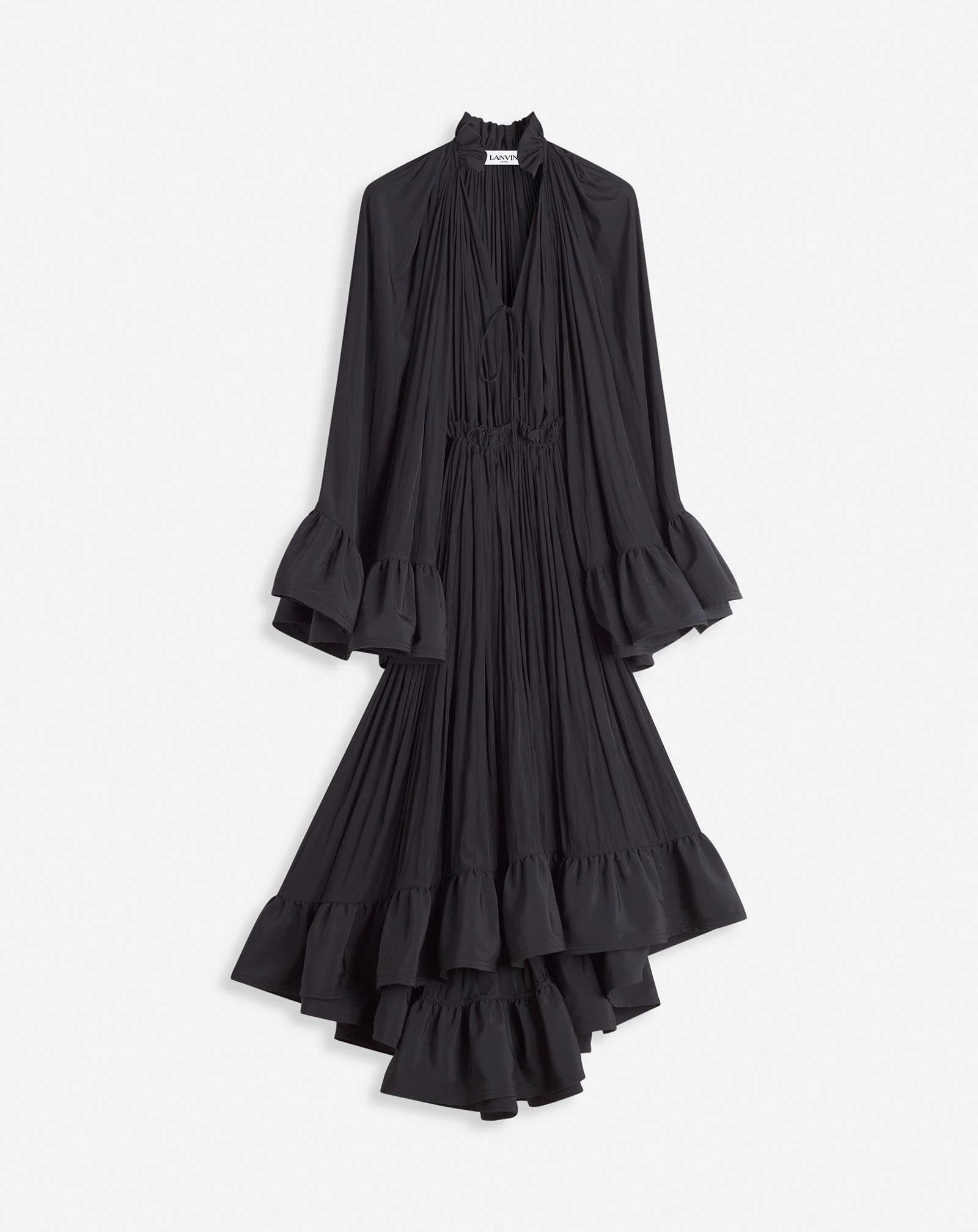 The pleats and frills of this dress create a fluid and chic movement. As evening wear, it embodies the elegance and femininity of the Lanvin wardrobe. Details - Charmeuse midi dress - Plunging frilled collar with a drawstring - Slip-on - Made in Portugal Size & fit - This style fits true to size, take your normal size - For more information, please see our size guide. Composition - Main fabric : 100% polyester woven SKU: RW-DRC042-4778-A241040