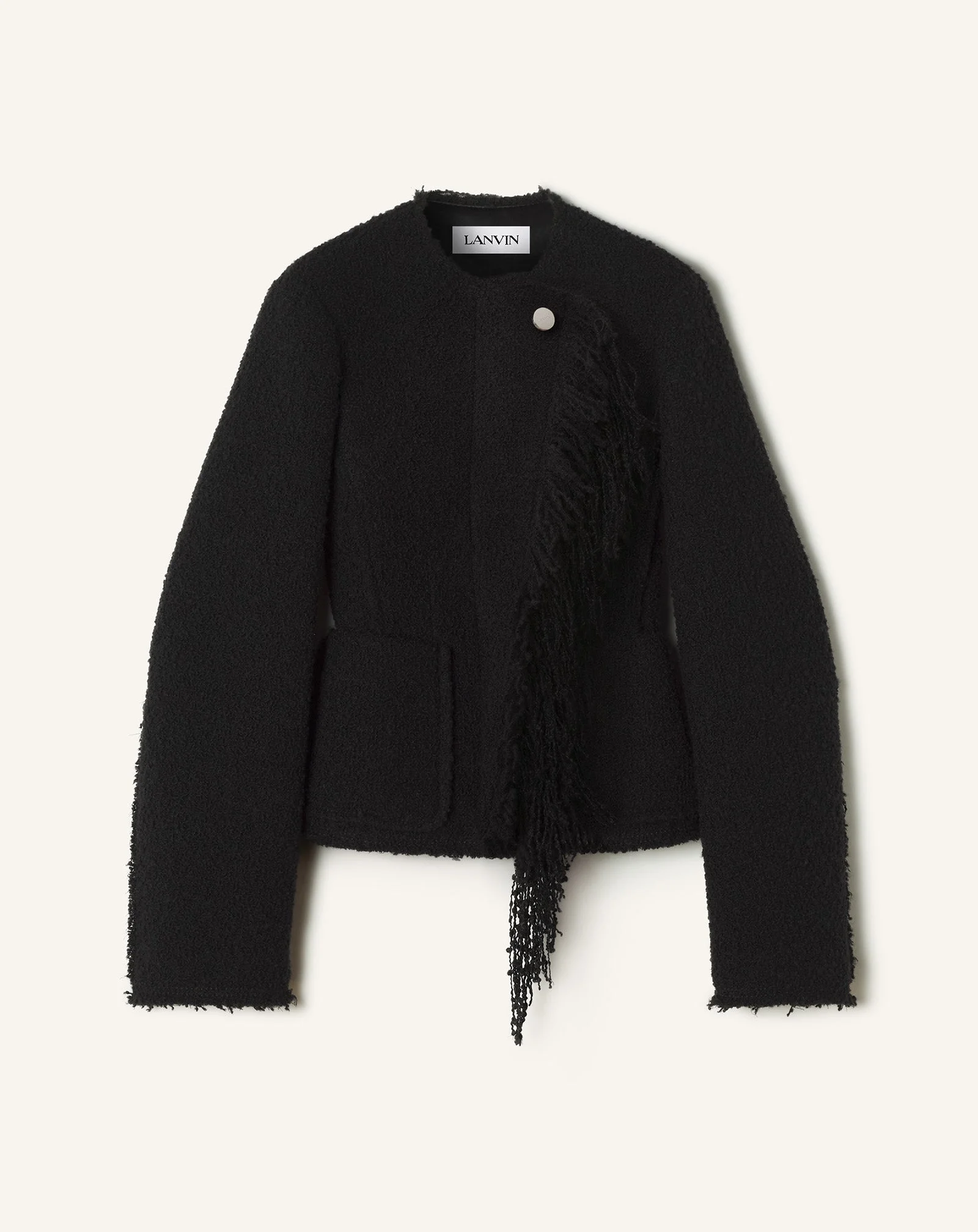 The tweed used to craft this jacket incorporates a blend of different wools, giving it a textured feel. The fabric has been enhanced with technical fibers to maximize its durability, without sacrificing its softness. With its asymmetrical closure and fringes, this jacket creates a modern silhouette with sophisticated details. This coat features armhole slits, allowing it to be worn as a cape . Details - Tweed collarless jacket - Tailored, asymmetrical design - Round neck - Raw edges at the neck, cuffs and hem - Fringes on the front - Armhole slits - Structured shoulders - Metal zipper and silver button closure - Two patch pockets - Made in Italy Size & fit - For more information, please see our size guide. Composition - Main fabric : 94% wool woven,6% polyamide woven - Lining : 100% cupro woven SKU: RW-JA0004-6135-H251036