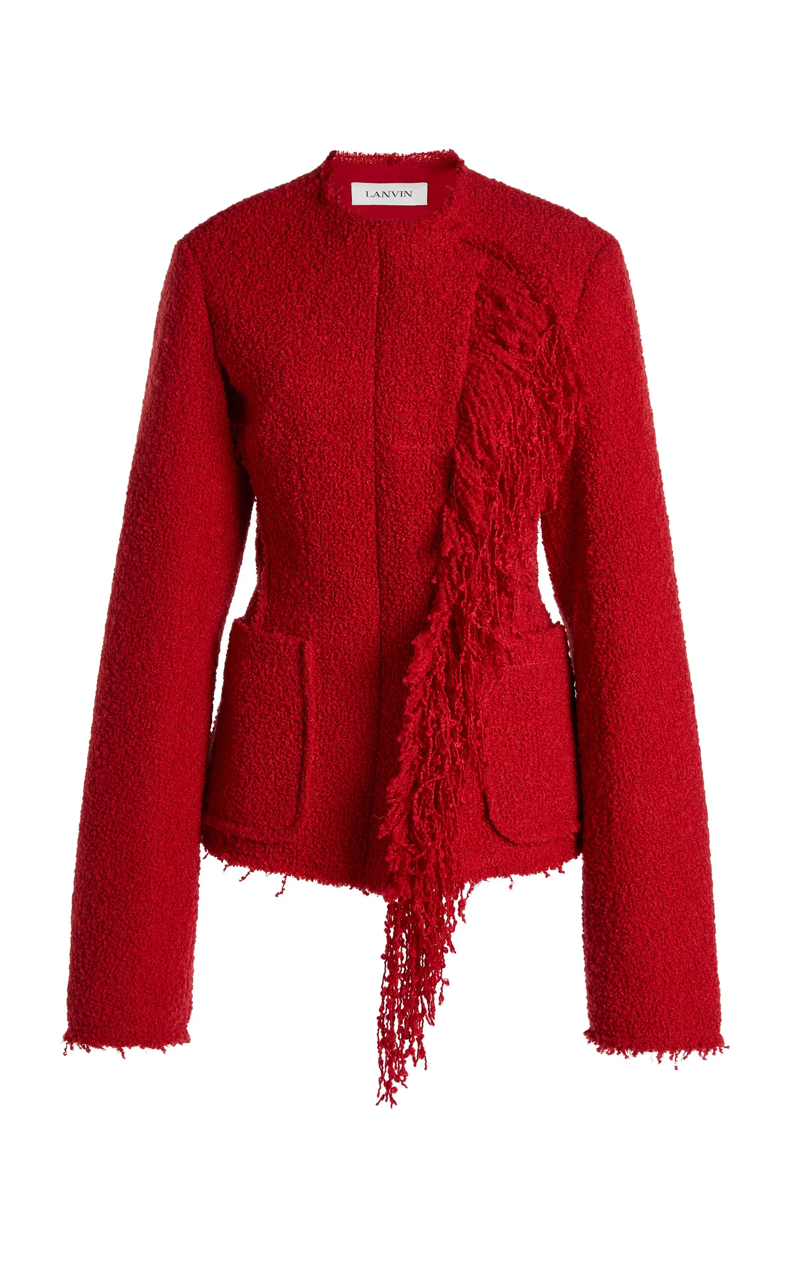 PRODUCT DETAILS - Collarless, fringed trim, fitted - Button fastening through front - Composition: 94% Wool Woven, 6% Polyamide Woven - Color: Black - Dry clean only - Pre-Fall '25