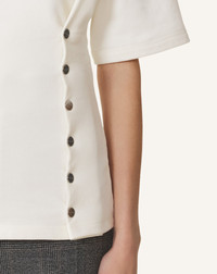 This collection features a jersey fabric crafted entirely from cotton, giving it a thick and substantial feel. Its cut is inspired by couture pieces, and its details, such as the snap buttons, add a contemporary touch to the silhouette. Details - Fitted jersey T-shirt - Round neck - Snap buttons on the front - Made in Italy Size & fit - For more information, please see our size guide. Composition - Main fabric : 100% cotton knitted SKU: RW-TS0016-F009-H25020XS